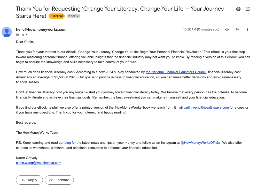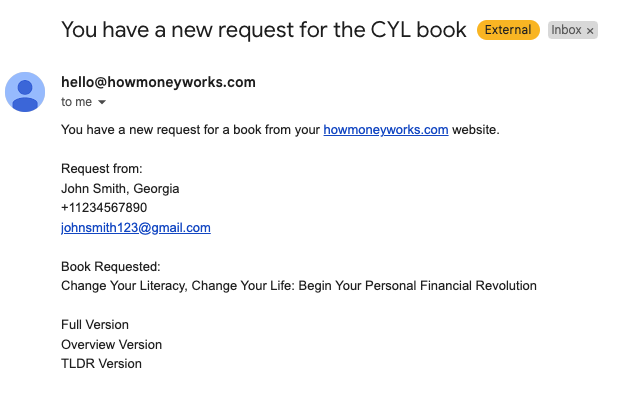 They'll also receive an email from hello@howmoneyworks.com with further details and acknowledgement of the agent whose link was used for the request. As an agent, you'll receive an email notification about this request, keeping you informed. Here's the email your contact will receive: