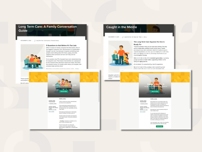If there’s one topic families are desperate for guidance on but rarely know how to start talking about, it’s long-term care. The need is rising, the cost is rising, and the confusion around it is skyrocketing. That’s why we’ve created ready-to-use Long-Term Care blogs and email templates for you.