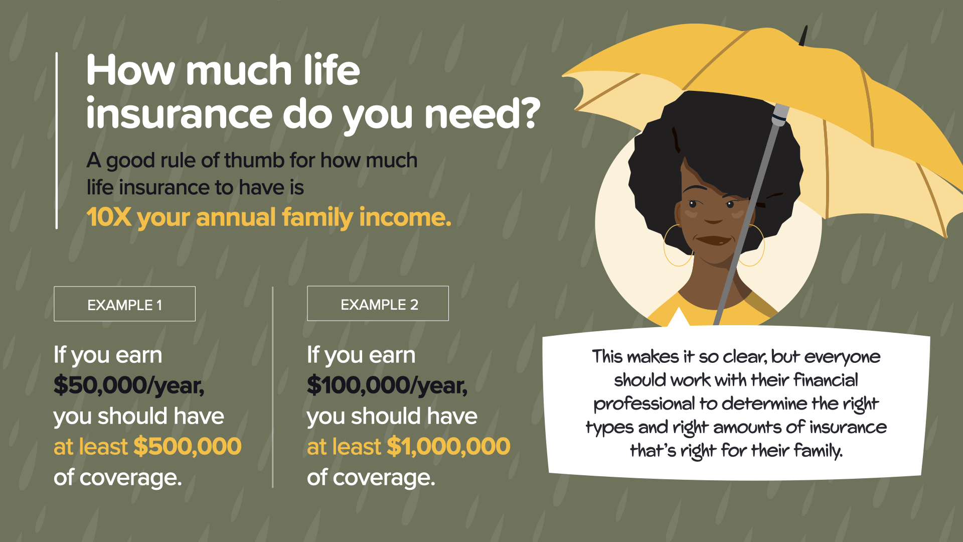 Similarly, if your annual income is $100,000, coverage of at least $1,000,000 is advisable.