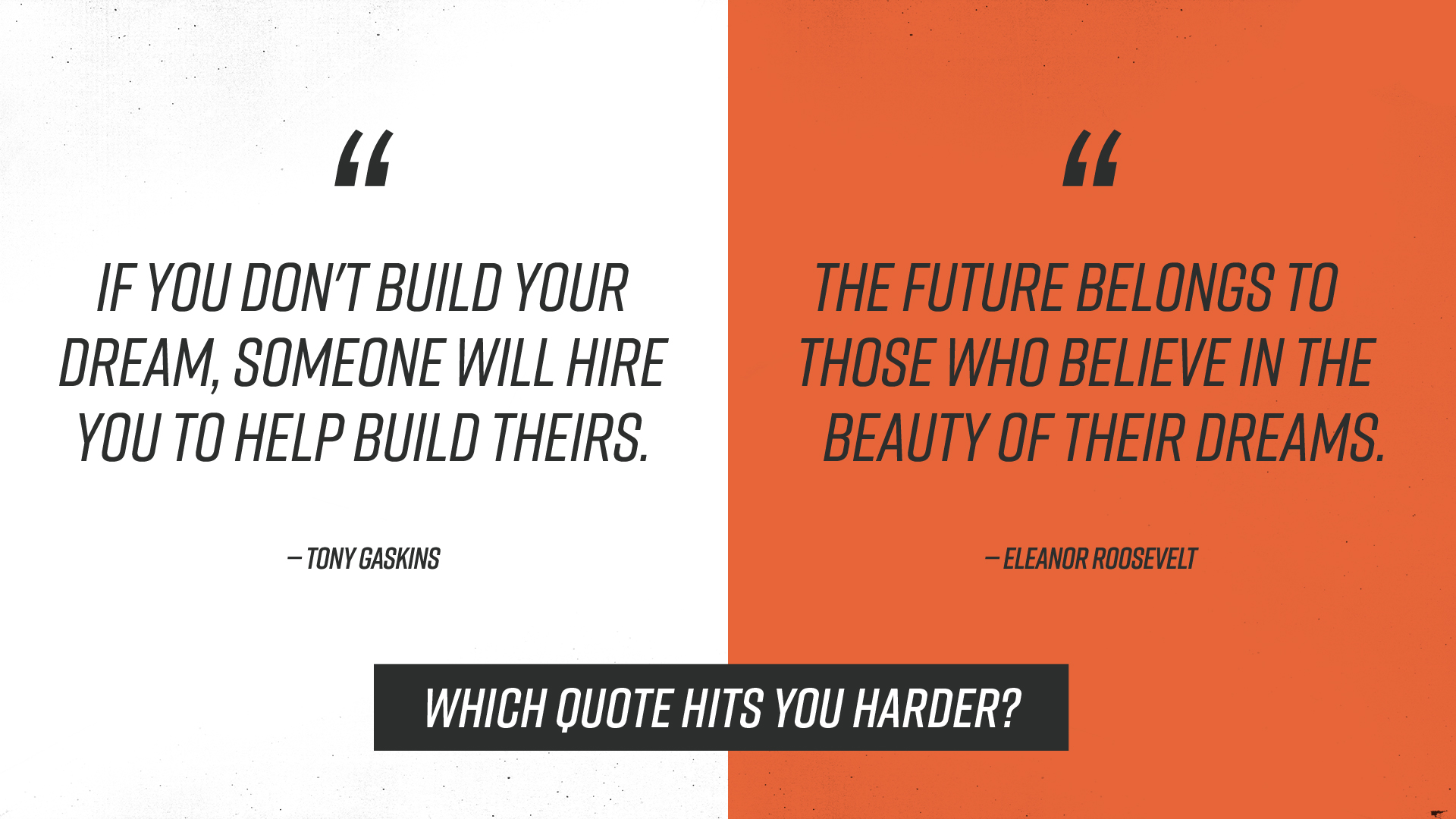Which of these 2 quotes hits you harder? The first is a powerful quote by Tony Gaskins, "If you don't build your dream, someone will hire you to help build theirs." Or do you prefer the famous words of wisdom by Eleanor Roosevelt, "The future belongs to those who believe in the beauty of their dreams." If you had to pick one or the other, which one is more "you"? [***Wait for answers from attendees***] Great comments! With these thoughts and feelings in mind, let's move on…