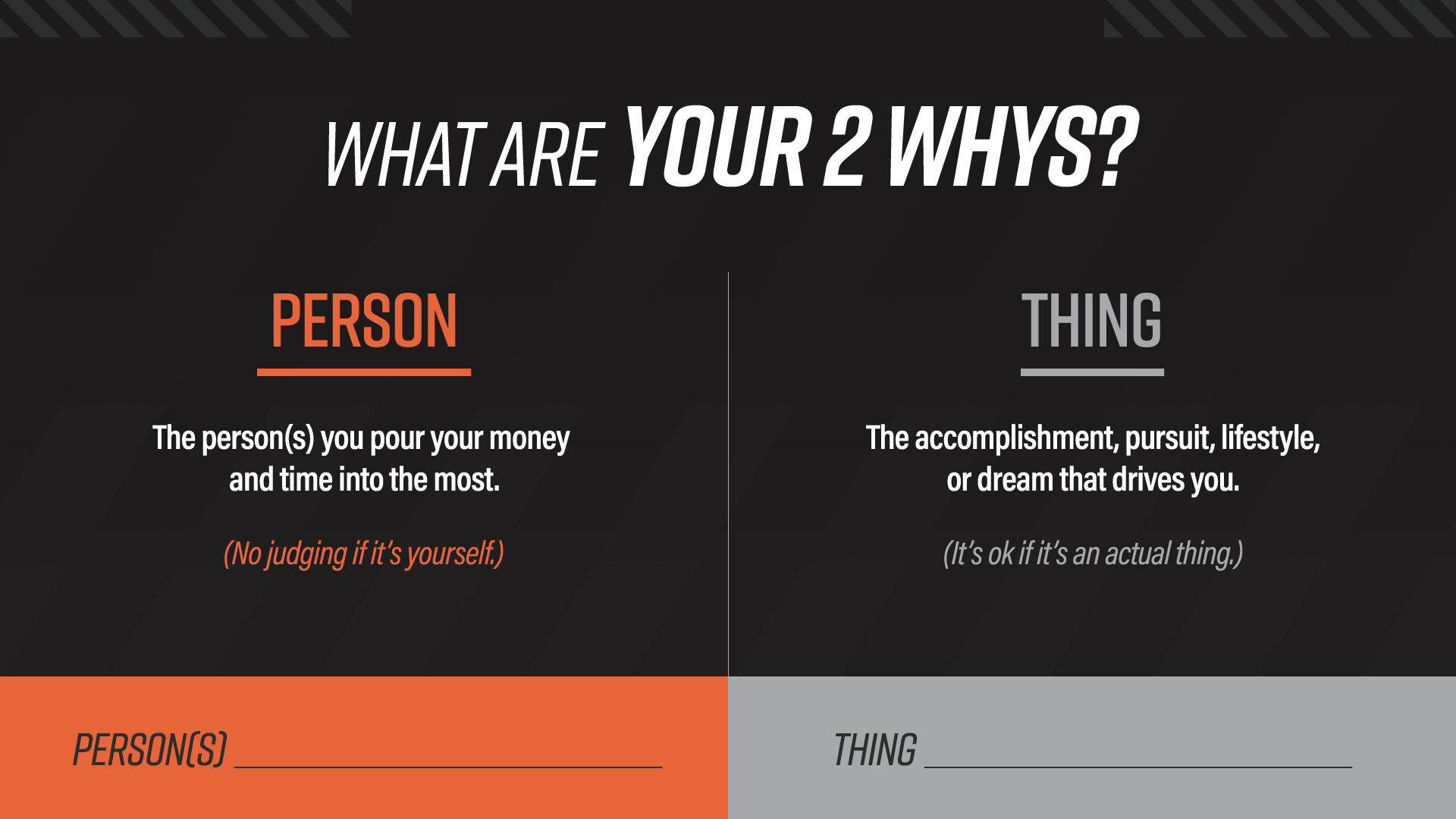 "What are your 2 why's?" Who do you pour your money and time into the most—it's OK if it's yourself—no judging here! And—what accomplishment, pursuit, lifestyle, or dream drives you the most—once again, it's OK if it's an actual thing. Let's hear some of your why's… [***Ask for answers from your attendees***] Terrific! Now that we know what makes you tick, let's do one more…