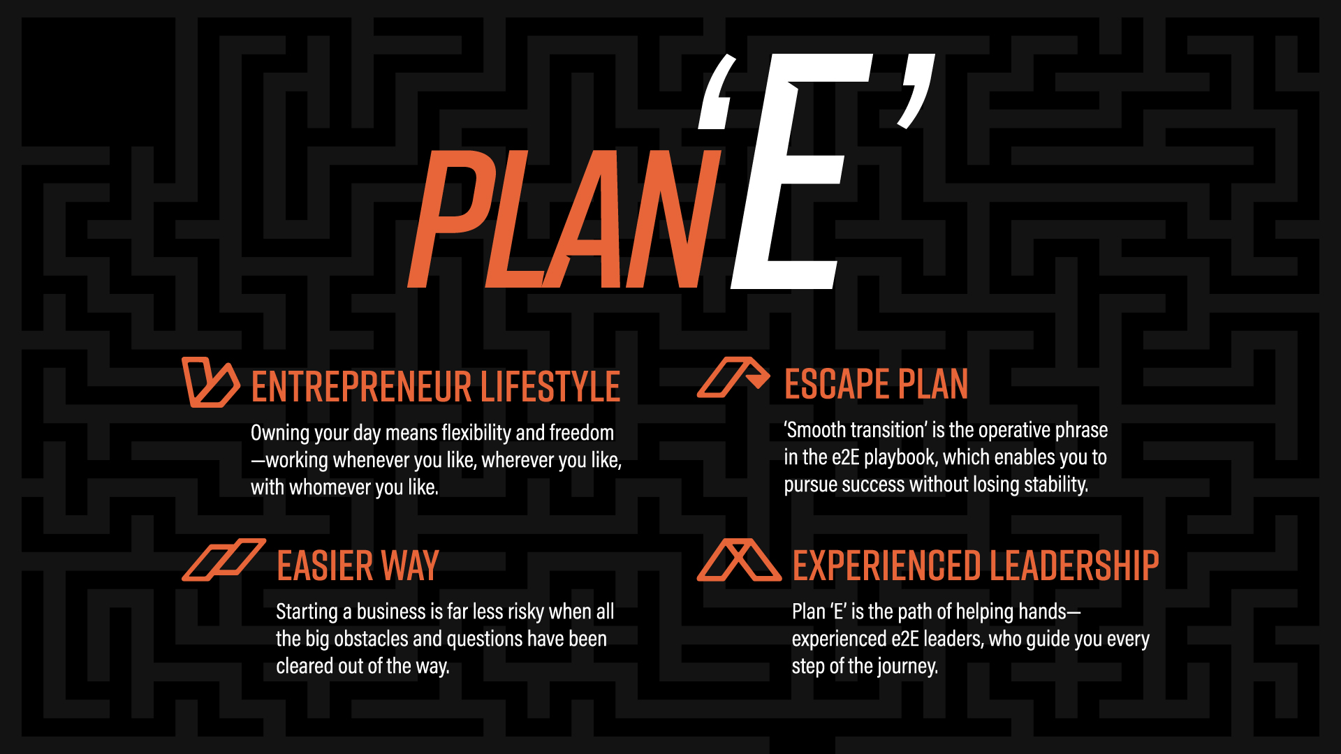 Your 'Plan E' leads to the entrepreneur lifestyle—owning your day, working when you want, collaborating with whomever you like. It's your escape plan for making a smooth transition from where you are to the business you want. Your entrepreneur plan gives you an easier way by lowering risks and removing obstacles. And most importantly, your 'Plan E' can put you in the helping hands of experienced e2E leaders who can guide you on your journey.