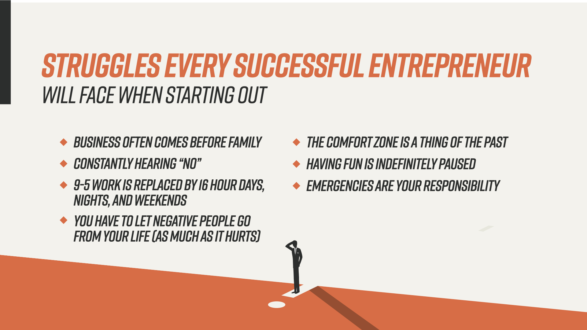 You're going to face a chasm of struggles. There's no way around it. The luxury of 9-5 days are a thing of the past—welcome to 16 hour days—even on weekends. Hobbies and entertainment? Park them. Business will come first—even before family for a time. Get used to hearing 'NO.' You'll need all the positivity you can get—so negative people in your life are out! Prepare for every day to be uncomfortable—and many filled with emergencies.