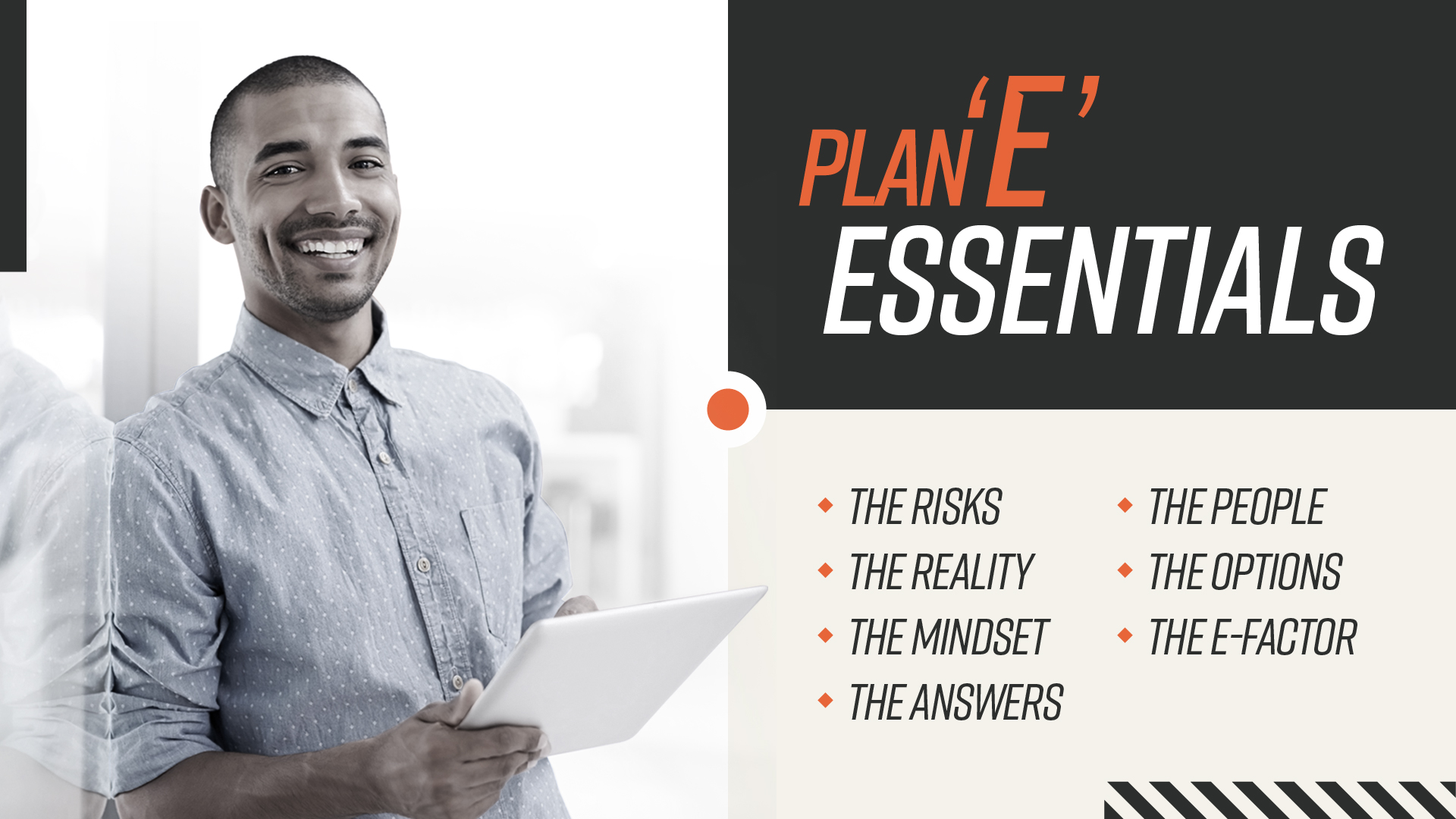 So let's explore the essential elements of a solid 'Plan E.' We're going to go over the RISKS, the REALITY, the MINDSET, the ANSWERS, the PEOPLE, the OPTIONS, and finally—the E-FACTOR!