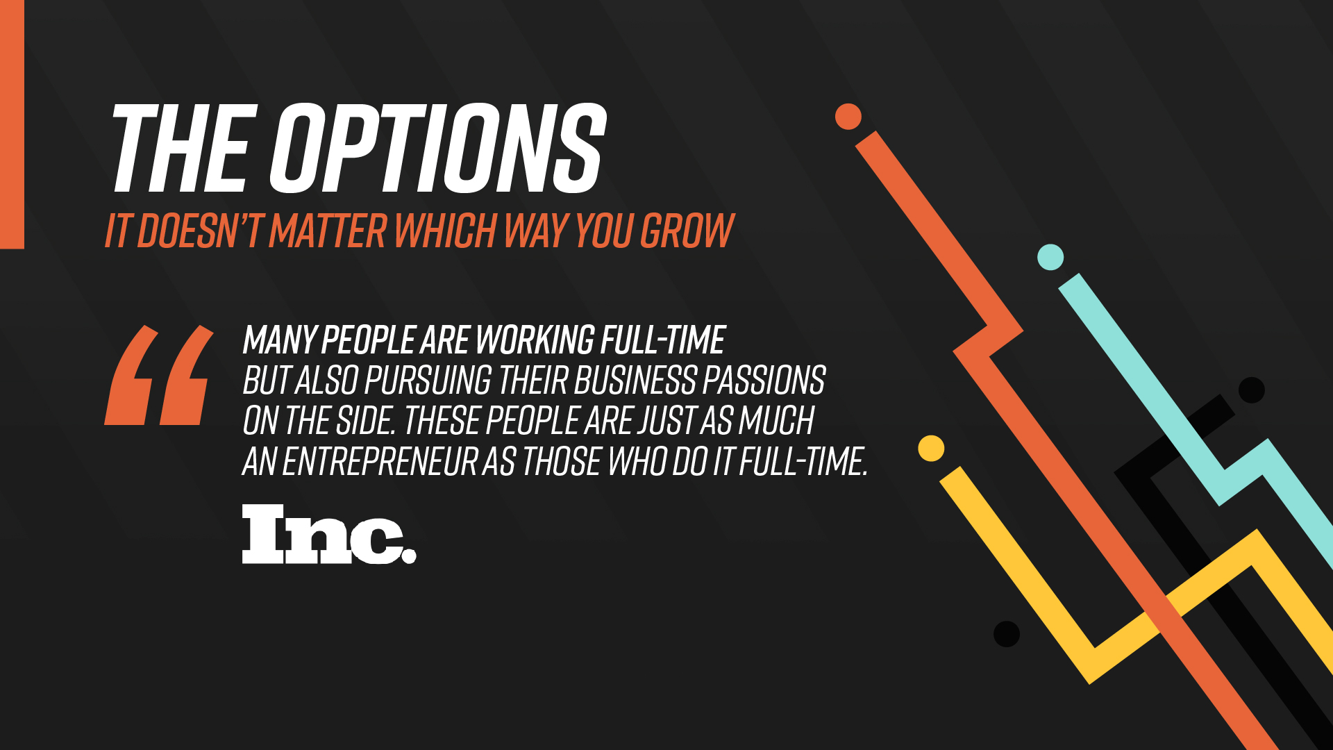 Take heart in this quote from Inc. Magazine: "Many people are working full-time but also pursuing their business passions on the side. These people are just as much an entrepreneur as those who do it full-time." Don't let anyone tell you your 4 hours a week working early mornings, late nights, or weekends is not the sweat of a true entrepreneur—or the foundation of a great business.