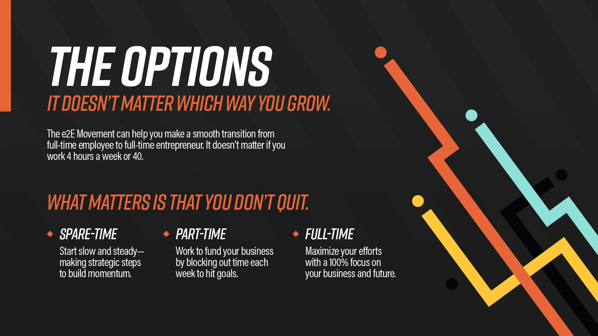 As we approach the finish line of your 'Plan E,' let's examine the OPTIONS available. Remember—you're the boss. You will decide if you work 4 hours a week, 40, or 80. Working more hours can give you velocity—but any number of hours is viable. It's up to you. Some entrepreneurs can produce substantial incomes with a very small, but very focused time investment. It all depends on the business you choose. Spare-time. Part-time. Full-time. Big time. You're the boss.