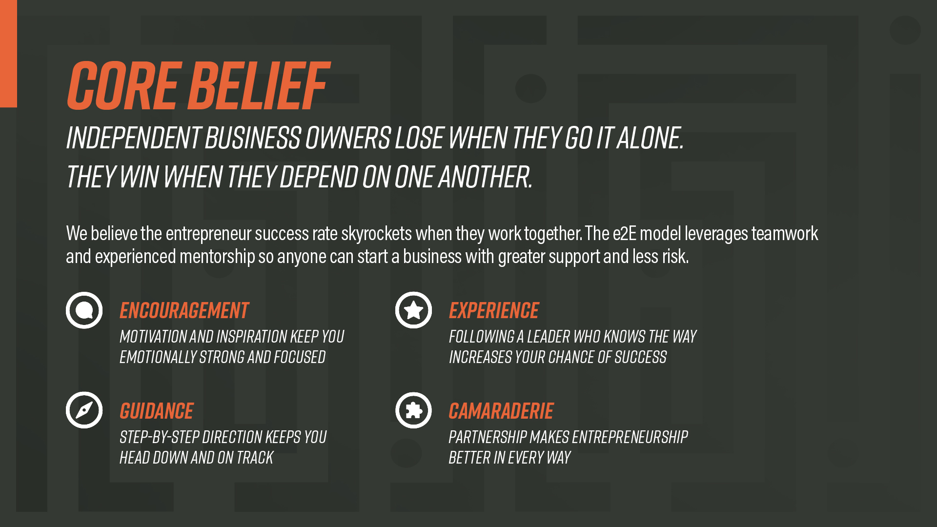 Our #1 core belief with e2E is that we lose when we go it alone, and we win when we depend upon one another. I had the right people to help me. That's why I do what I do with e2E now—to pay it forward. Mentorship is essential for entrepreneurs to succeed. At every step, we all need the strength of ENCOURAGEMENT—step-by-step GUIDANCE—EXPERIENCE from those who have gone before us—and CAMARADERIE, the all important laughter, support, and friendship that help us bear the defeats and share the victories.