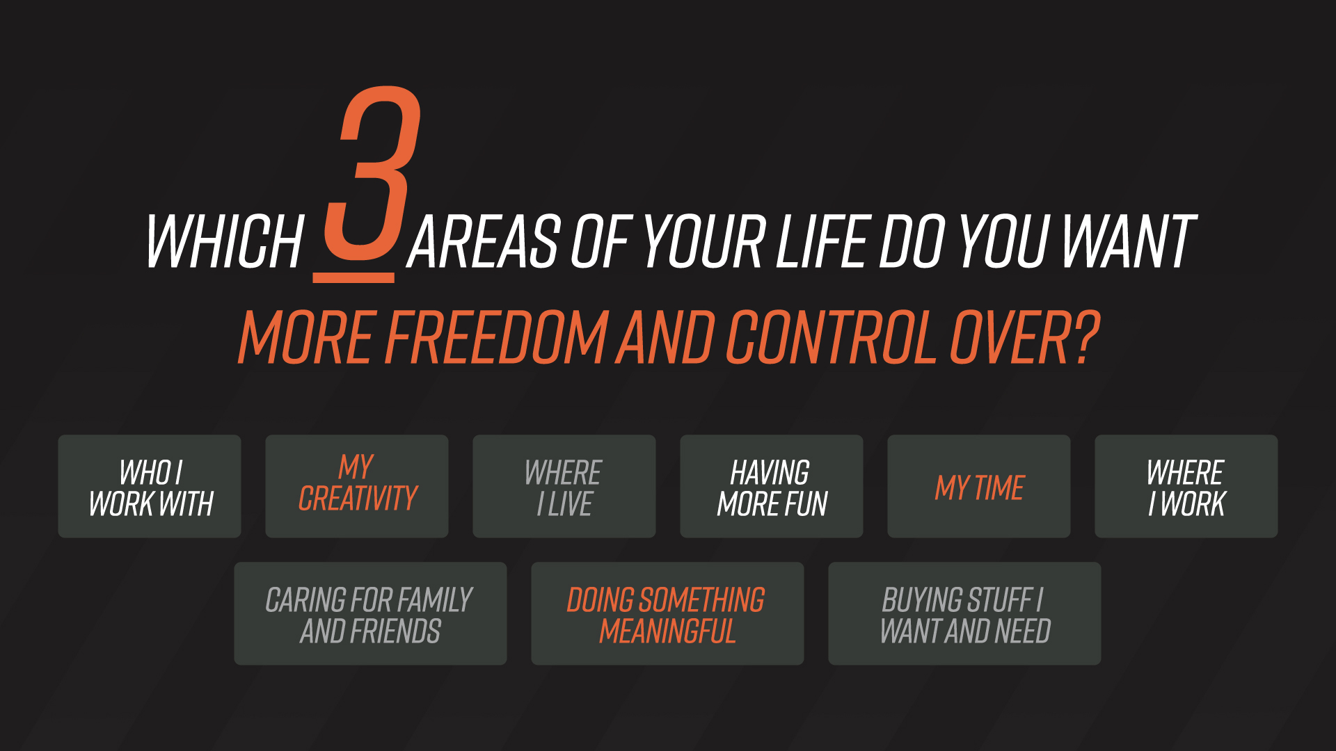 The first one is a bit personal—that's good because even though entrepreneurship is business—it's also very personal—and it WILL reflect everything about who you are. "Which 3 areas of your life do you want more freedom and control over?" There's no wrong answer, of course—which ones resonate with you? [***Wait for a few answers***] Great answers!—now let's move on to the next question…