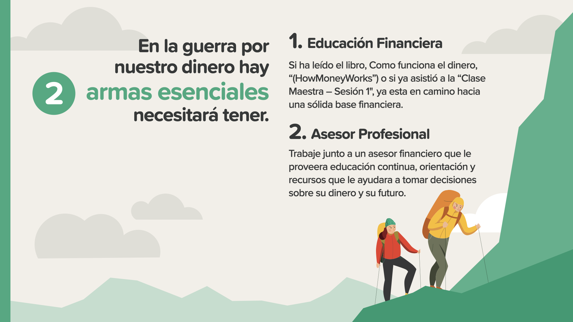 En la guerra por su dinero, hay dos armas esenciales que necesitará para poder ganar. Sabemos que el mejor punto de partida para todos es combinar una educación financiera con un asesor financiero. Tome esta educación seriamente. No la obtuvo de la escuela, de sus padres o de sus amigos. Trate sus finanzas con el nivel de dedicación que pone en su salud. Busque en Google, haga preguntas... pero luego recurra a alguien en quien confíe que se dedique a las finanzas.