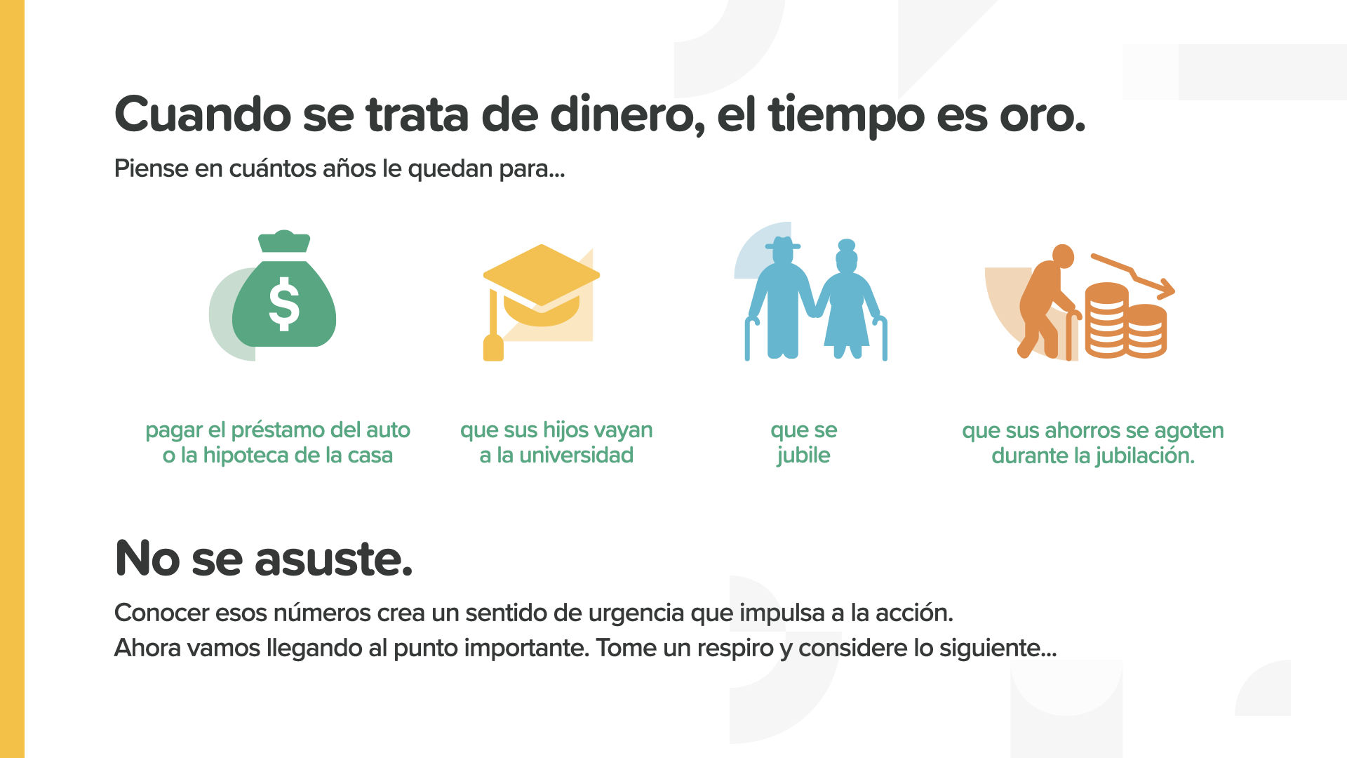 Este puede ser un buen momento para que usted comience a aplicar estos principios y ver que le espera. Anote su edad y cuánto necesita ahorrar de acuerdo con la Slide anterior. ¿Qué pasa si espera 5 años? ¿Cuán rápido ha pasado los últimos 5 años? Todo el mundo necesita saber esta información ahora porque el tiempo se está agotando.