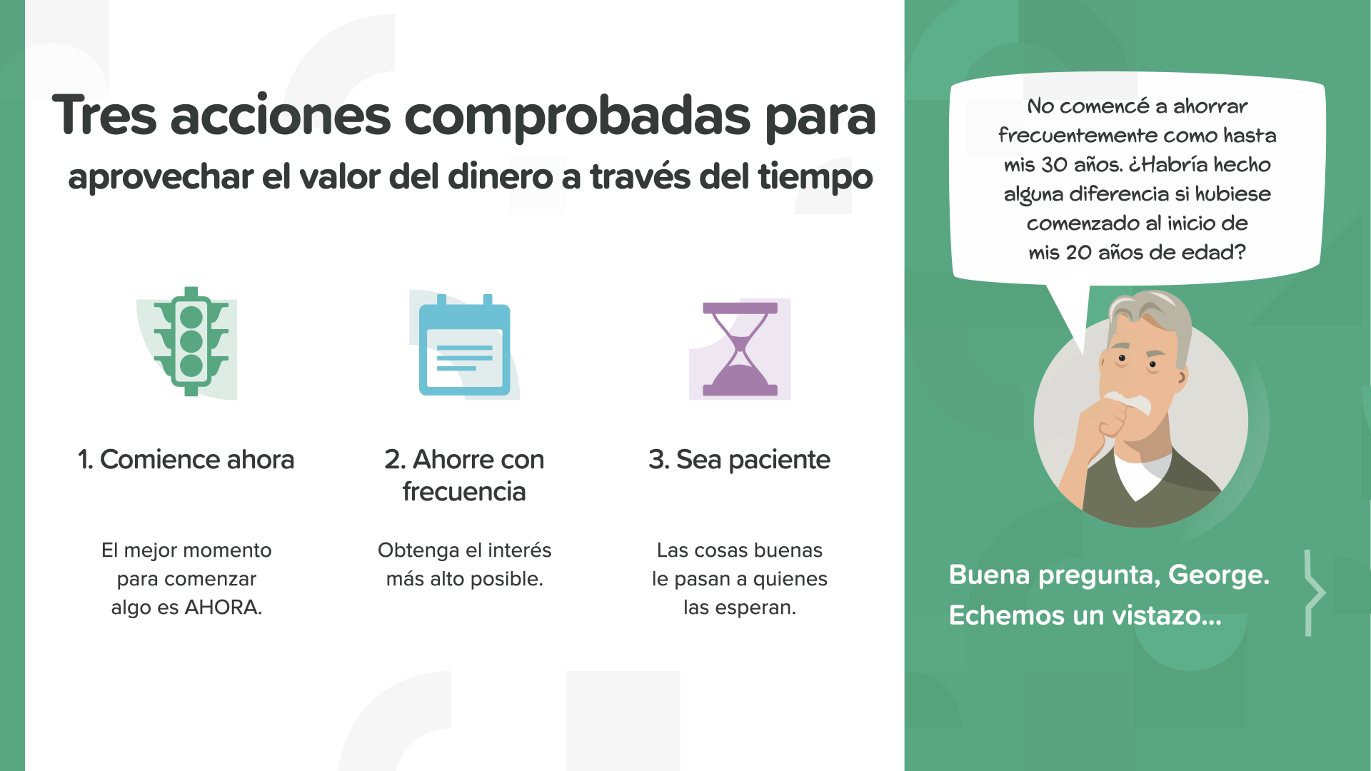 Hay tres maneras de aprovechar el valor temporal del dinero. Comience desde ahora, ahorre regularmente y tenga paciencia.
