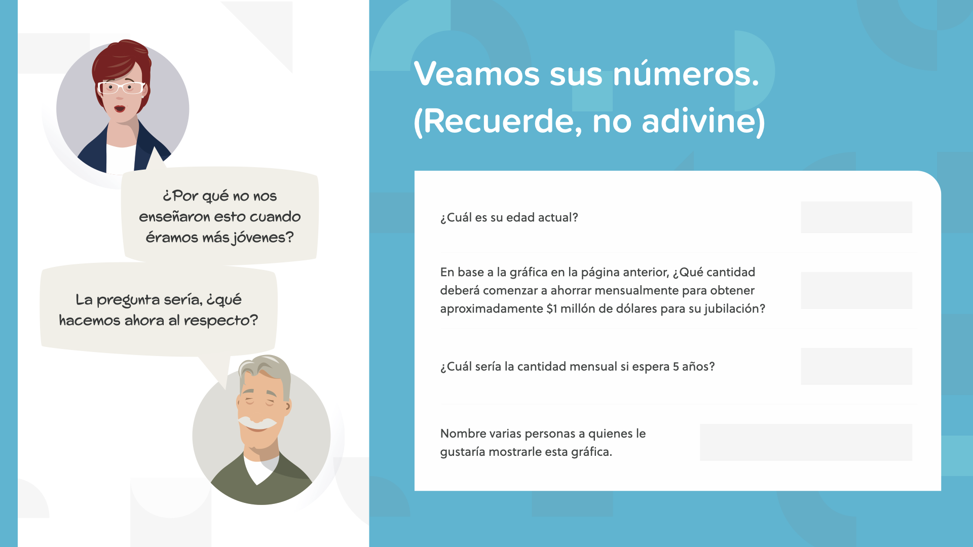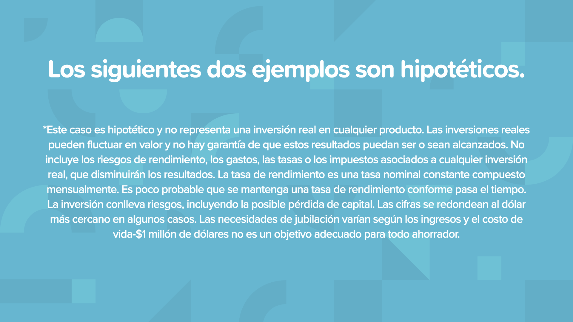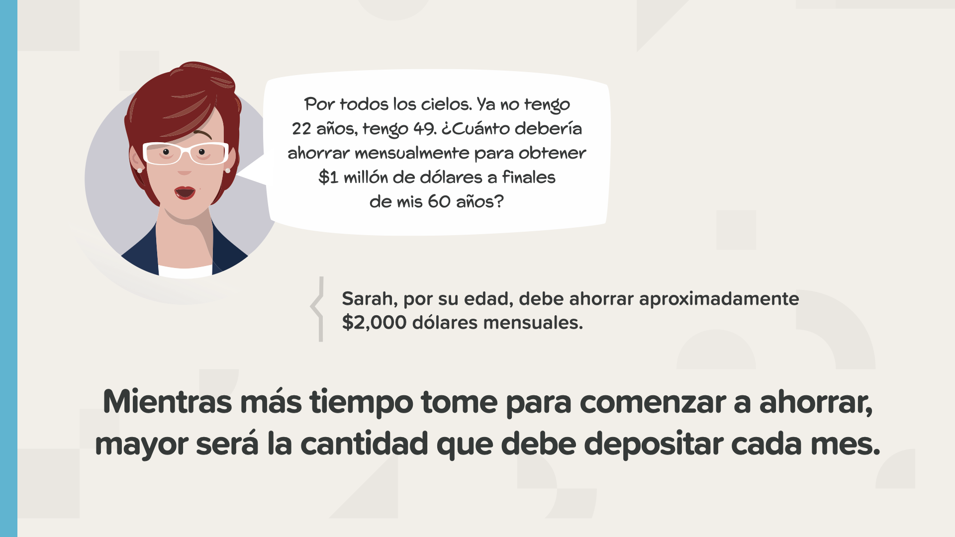Héctor no tiene $13,000, pero quiere que su hijo se jubile con un millón de dólares. Sus familiares y él trabajan juntos y logran ahorrar sólo $2,500 dólares para luego depositar sólo $250 dólares mensualmente durante los próximos 4 años. Entonces, como por arte de magia, también darán justo en el blanco. Su hijo también se retirará con un millón de dólares.