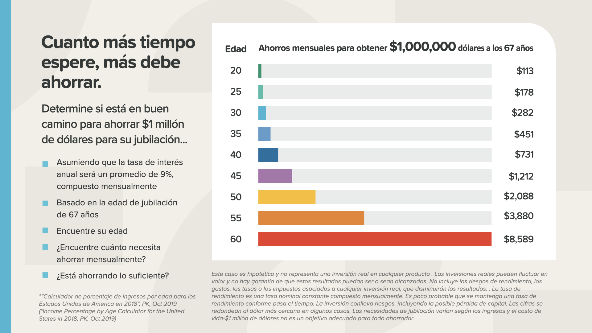 Aquí hay una gráfica que desglosa cuanto debe ahorrar por edad. Por cada millón que usted quiera en la jubilación, podrá observar la cantidad mensual que necesita ahorrar para conseguirlo. A los 30 años, necesita ahorrar $282 mensual para tener $1 millón al momento de jubilación. Pero si espera hasta los 40 años, necesitará ahorrar $731 mensual. En algún momento, superará su capacidad de ahorrar la cantidad mensual requerida. No debe permitir que esto ocurra. En ese momento, tendrá dos opciones: restringir sus sueños o encontrar una manera de ganar más dinero.