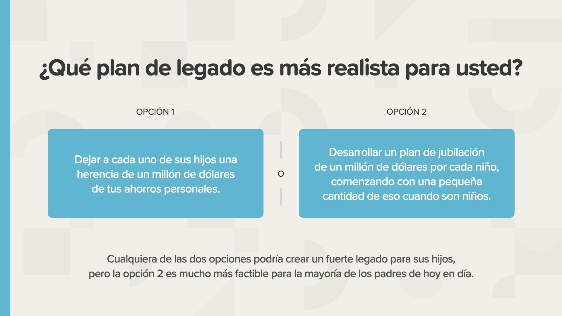 Ahora, veamos un ejemplo de algo con lo que la mayoría de los padres sueñan. Si tiene hijos, o planea tenerlos, siempre desea que estén mejor que uno mismo. Eso es natural. Este ejemplo es una reinvención de cómo los padres pueden dejar un legado a sus hijos. Es una estrategia que aplica el poder del interés compuesto y el valor temporal del dinero de manera que hace que la tradicional transferencia de riqueza al partir de esta vida parezca anticuada e innecesaria. Lo llamamos, El bebé del millón.
