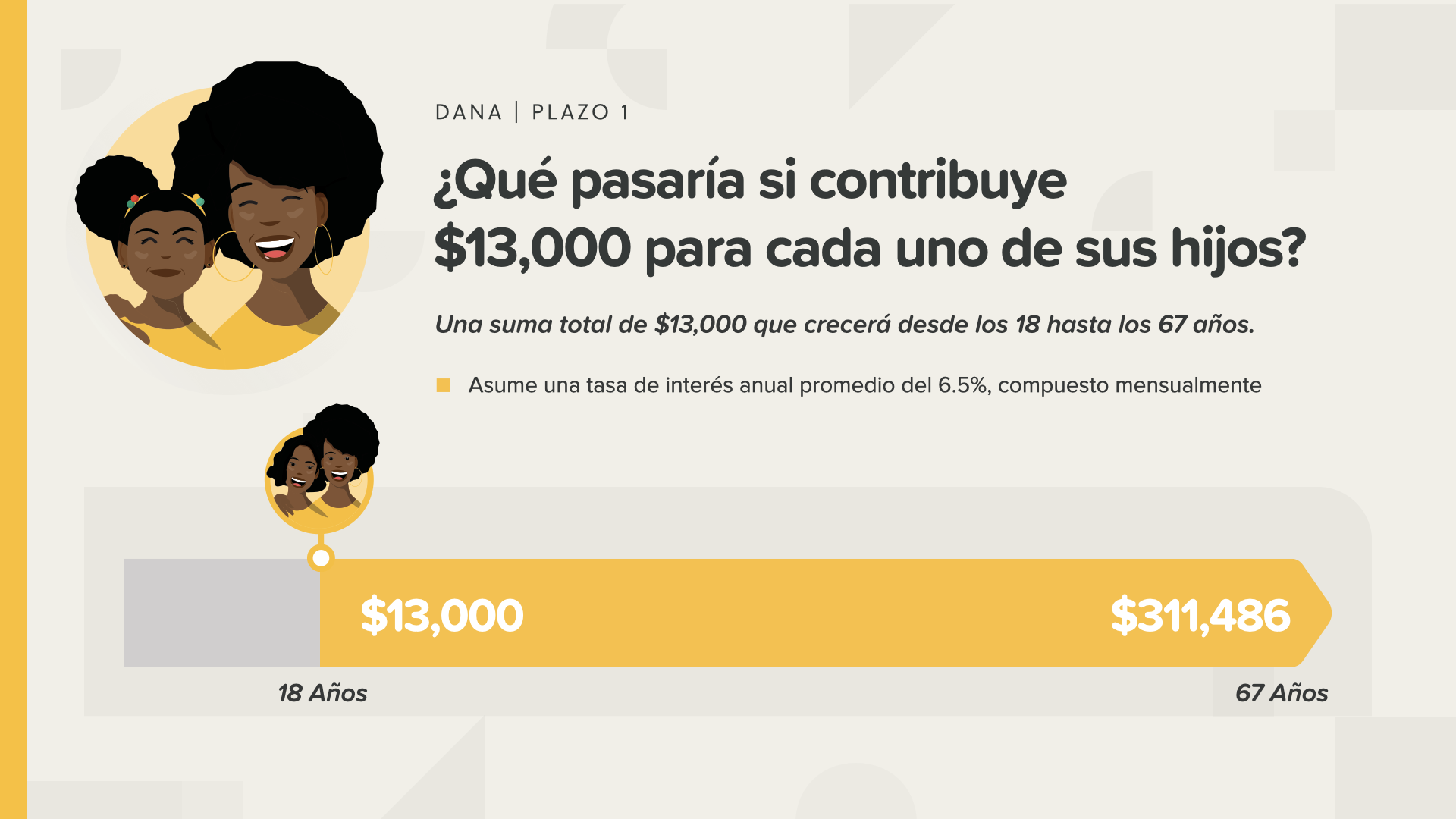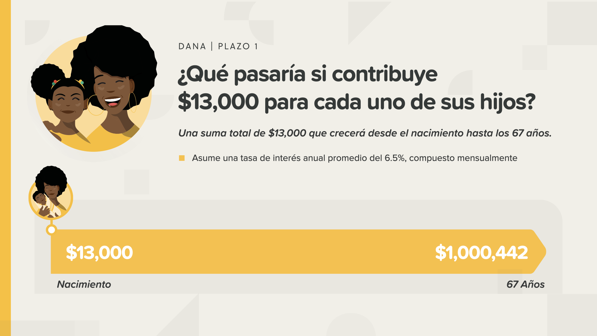 En este ejemplo, Dana contribuye $13,000 solo una vez y los deja allí desde el nacimiento de su hija hasta que ésta cumple 67 años. Esta suma crece a 6.5% y resulta en un poco más de un millón de dólares.