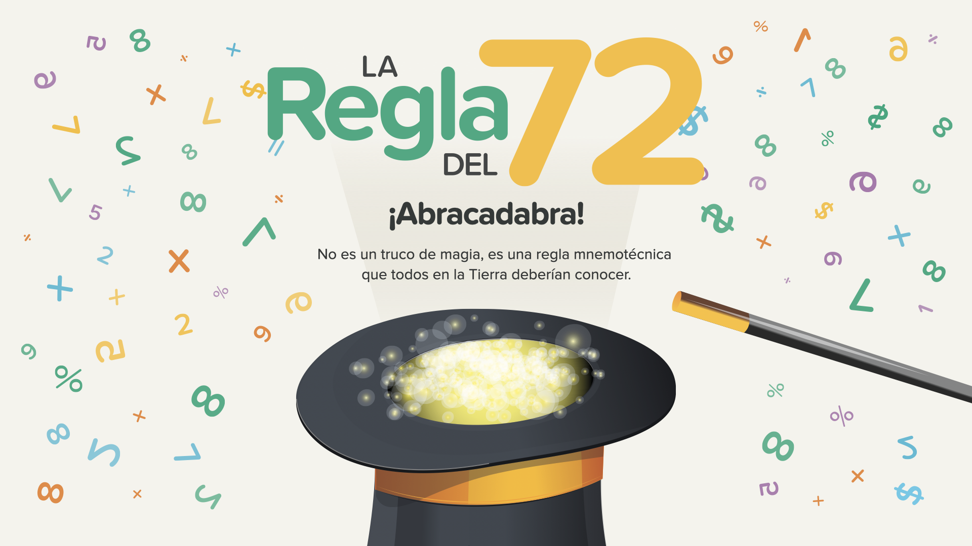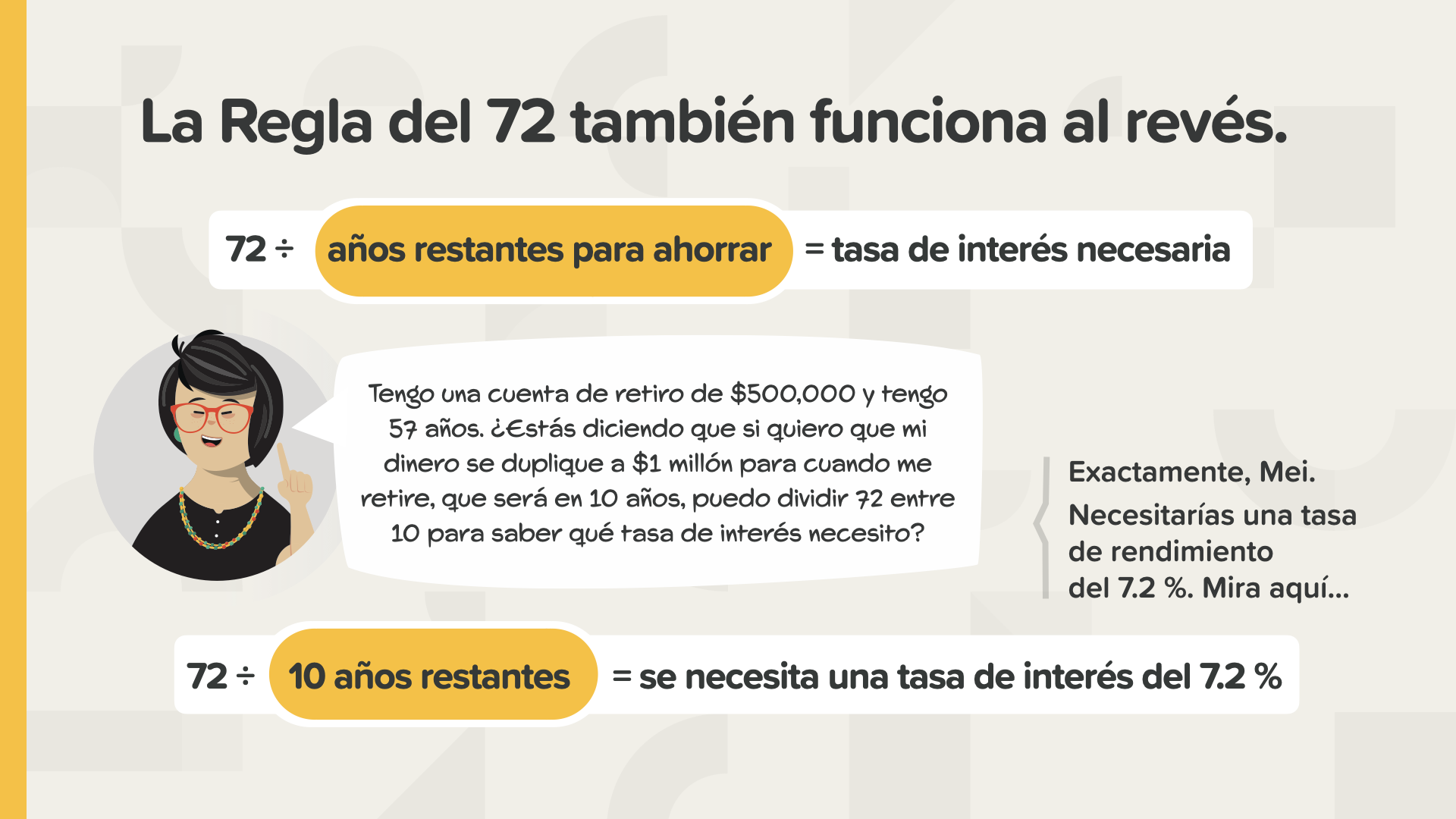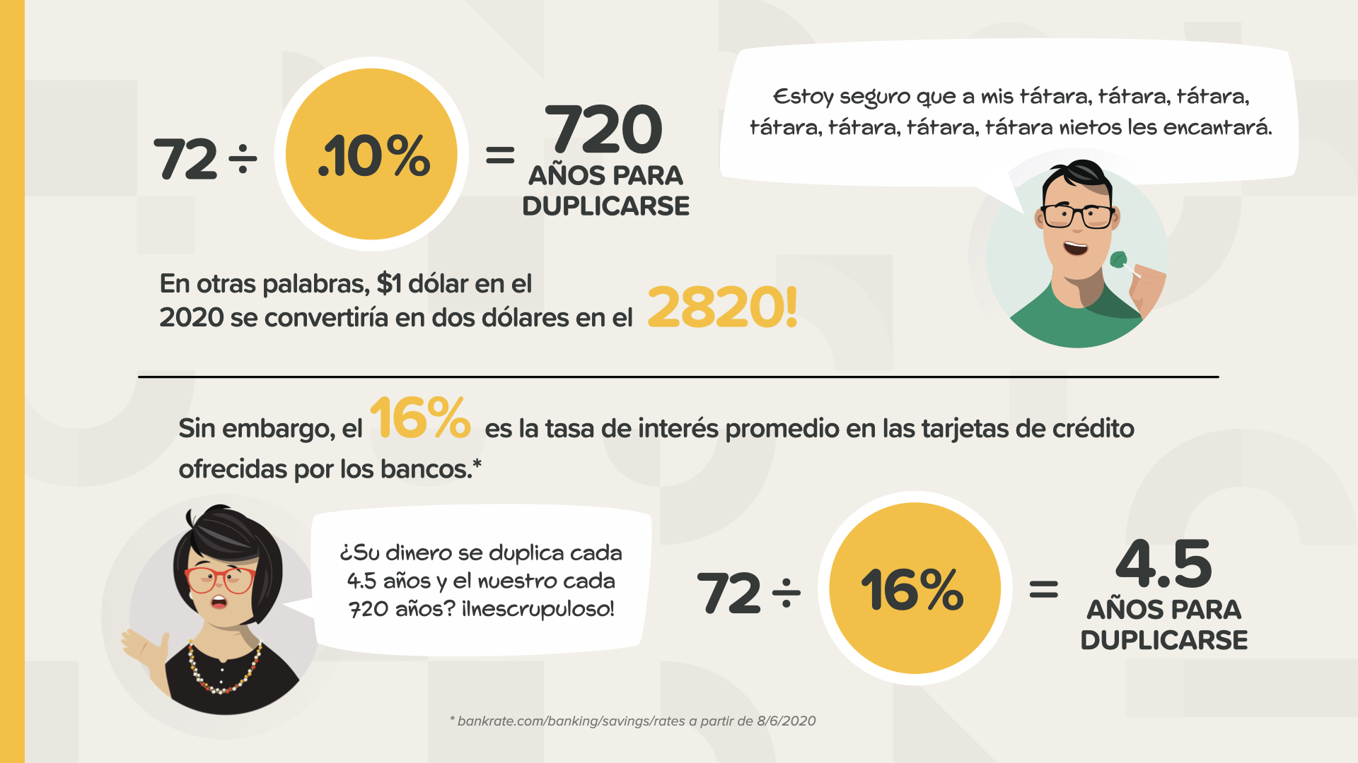 Simplemente divide cualquier tasa de interés entre 72 y esto le dirá cuánto tiempo se tardará el dinero en duplicarse. Funcionará para USTED si ahorra dinero. Trabajará EN SU CONTRA si toma dinero prestado.
