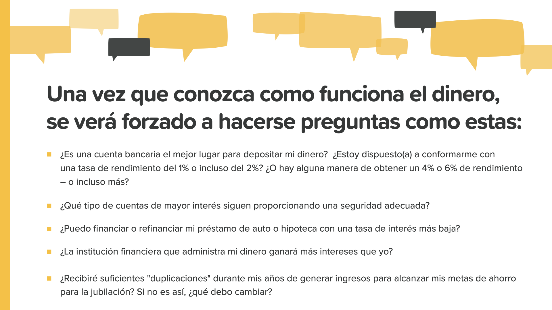 Ya estamos culminando el curso de hoy. Los principios/conceptos como los que acaba de aprender tendrá preguntas como las que ve en esta Slide. ¿Debería utilizar una cuenta bancaria? ¿Qué otras opciones son seguras? ¿Debería refinanciar un préstamo a un interés más bajo? ¿Qué puede hacer para hacer posible más duplicaciones? Un asesor financiero es la mejor persona a la que acudir para preguntas como estas y otras. Podemos discutir esto con usted si no tiene uno o si necesita ayuda para elegir uno.