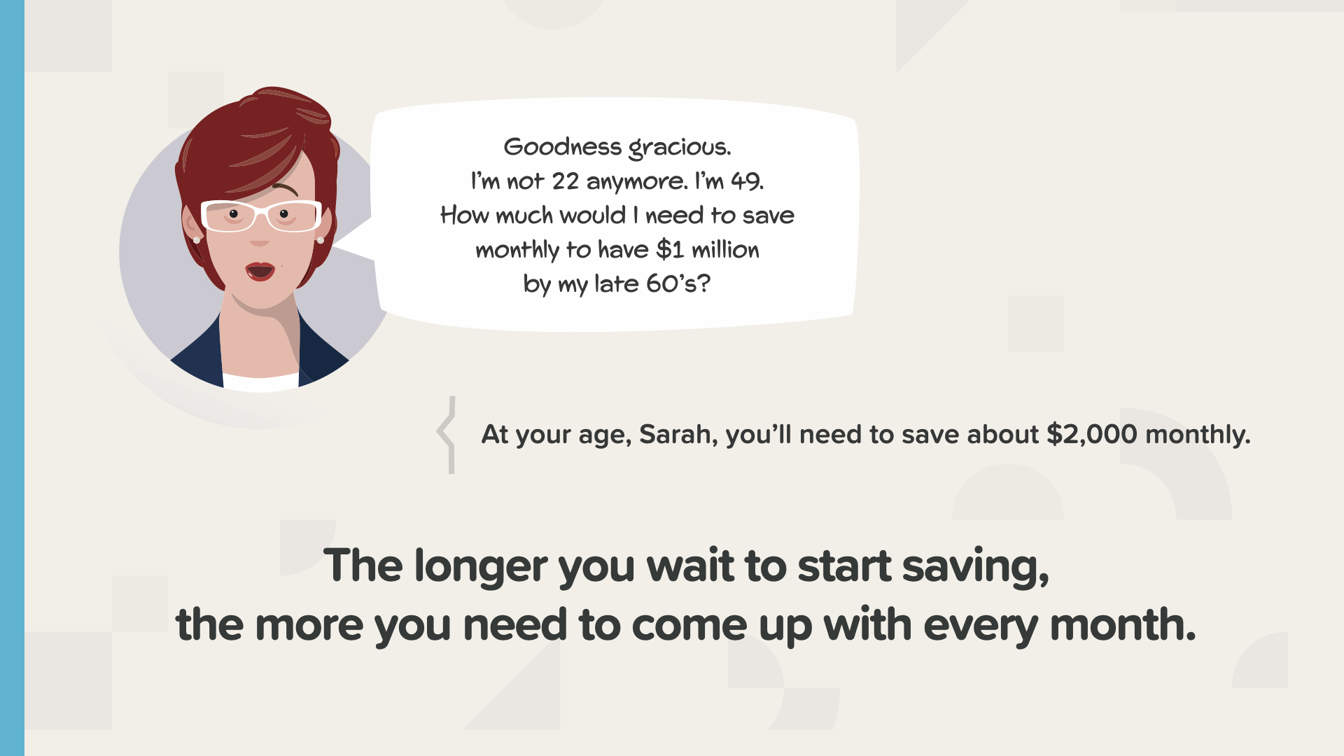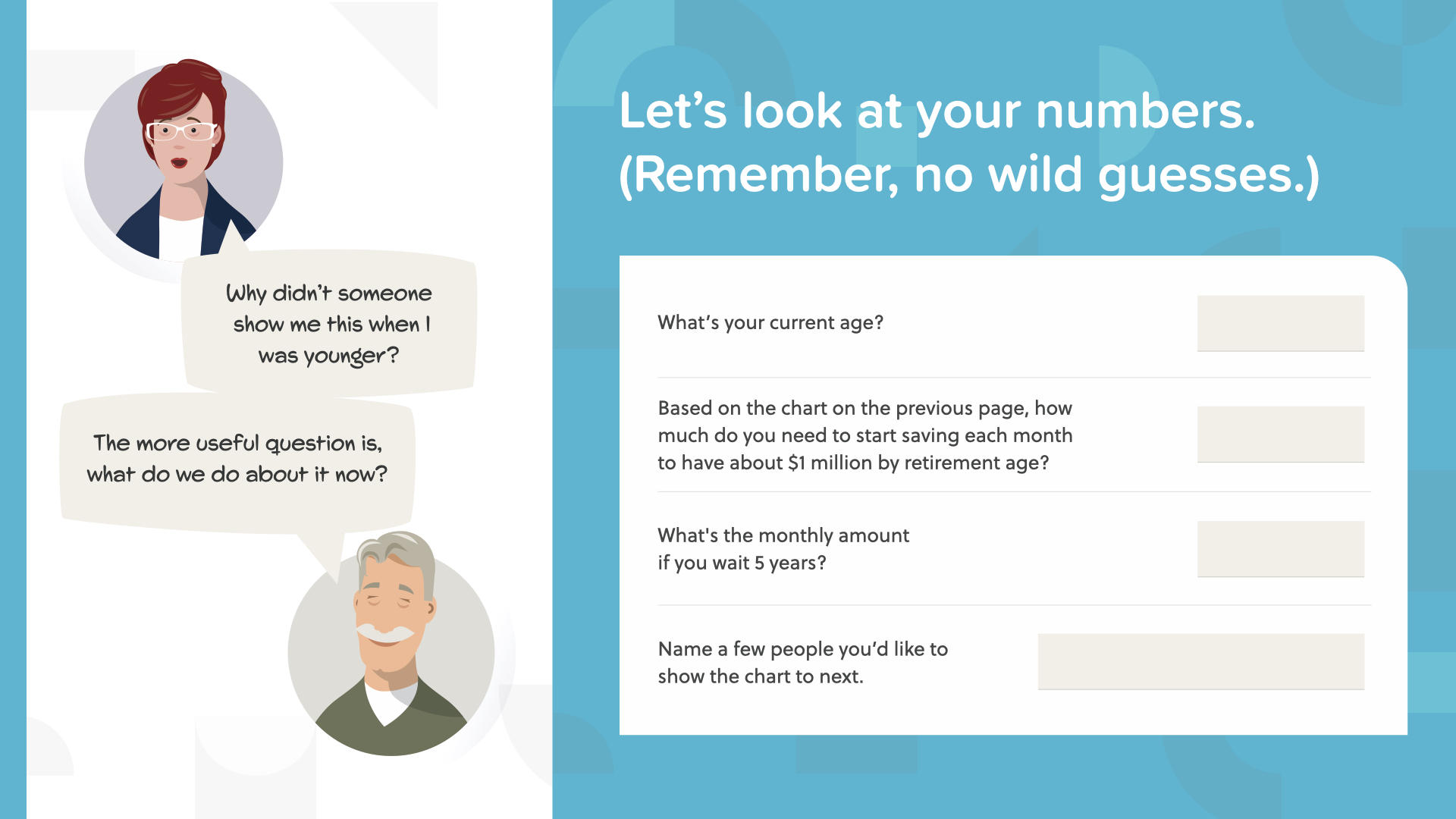 Now might be a good time to start applying these principles for yourself and see what that looks like. Write down your age and how much you need to save from the previous slide. What happens if you wait 5 years? How fast have the last 5 years flown by? Everyone needs to know this information now because time is ticking away.