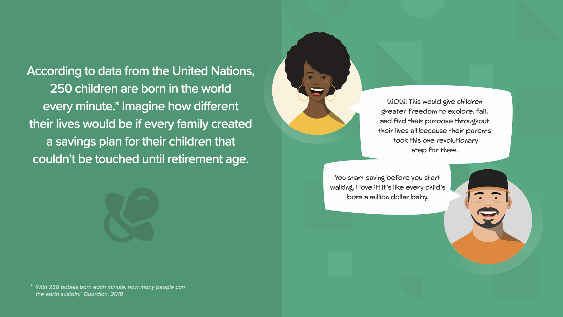 Those 250 children born every minute could live a different life if their parents or grandparents did this for them when they were young. As Hector puts it, they can start saving before they start walking!