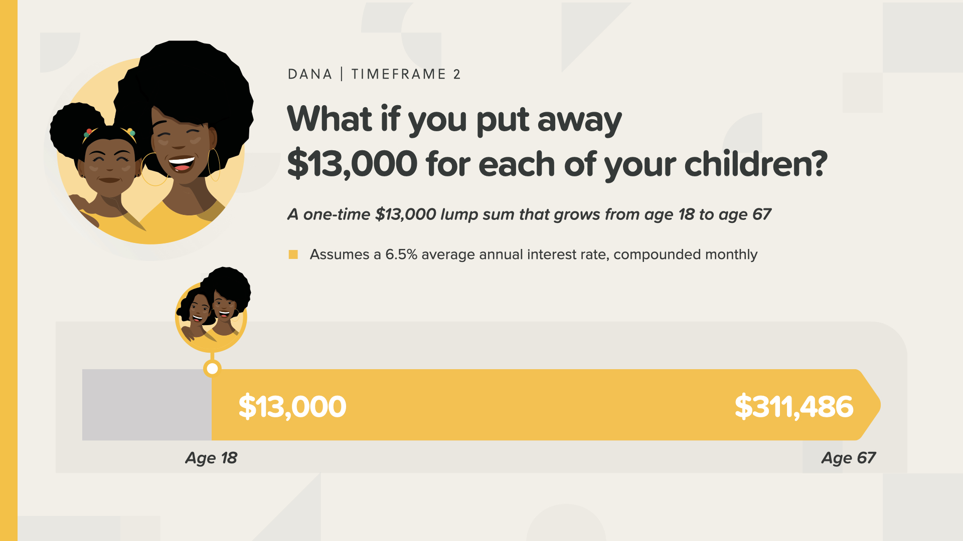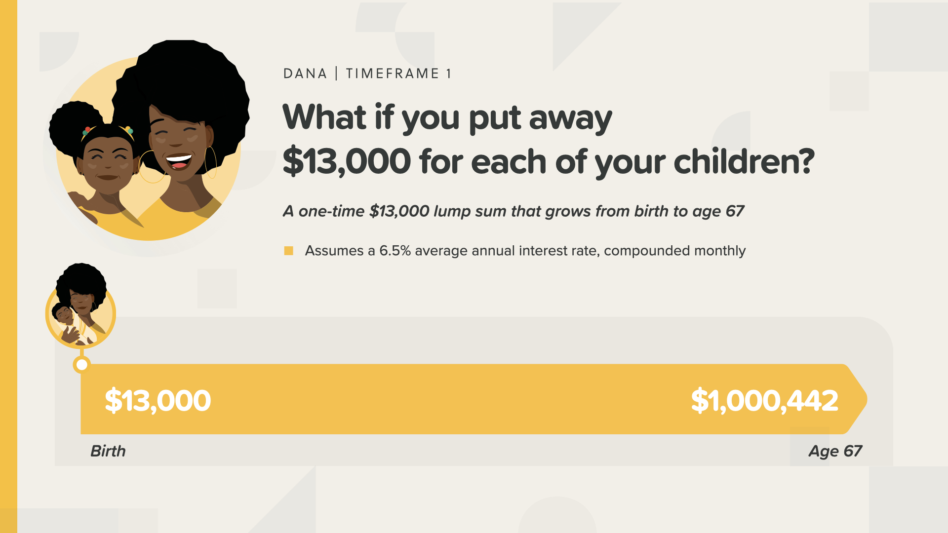 In this example, Dana puts $13,000 aside one time and leaves it there from her daughter’s birth until her daughter turns 67. It grows at 6.5% to a little over $1 million.