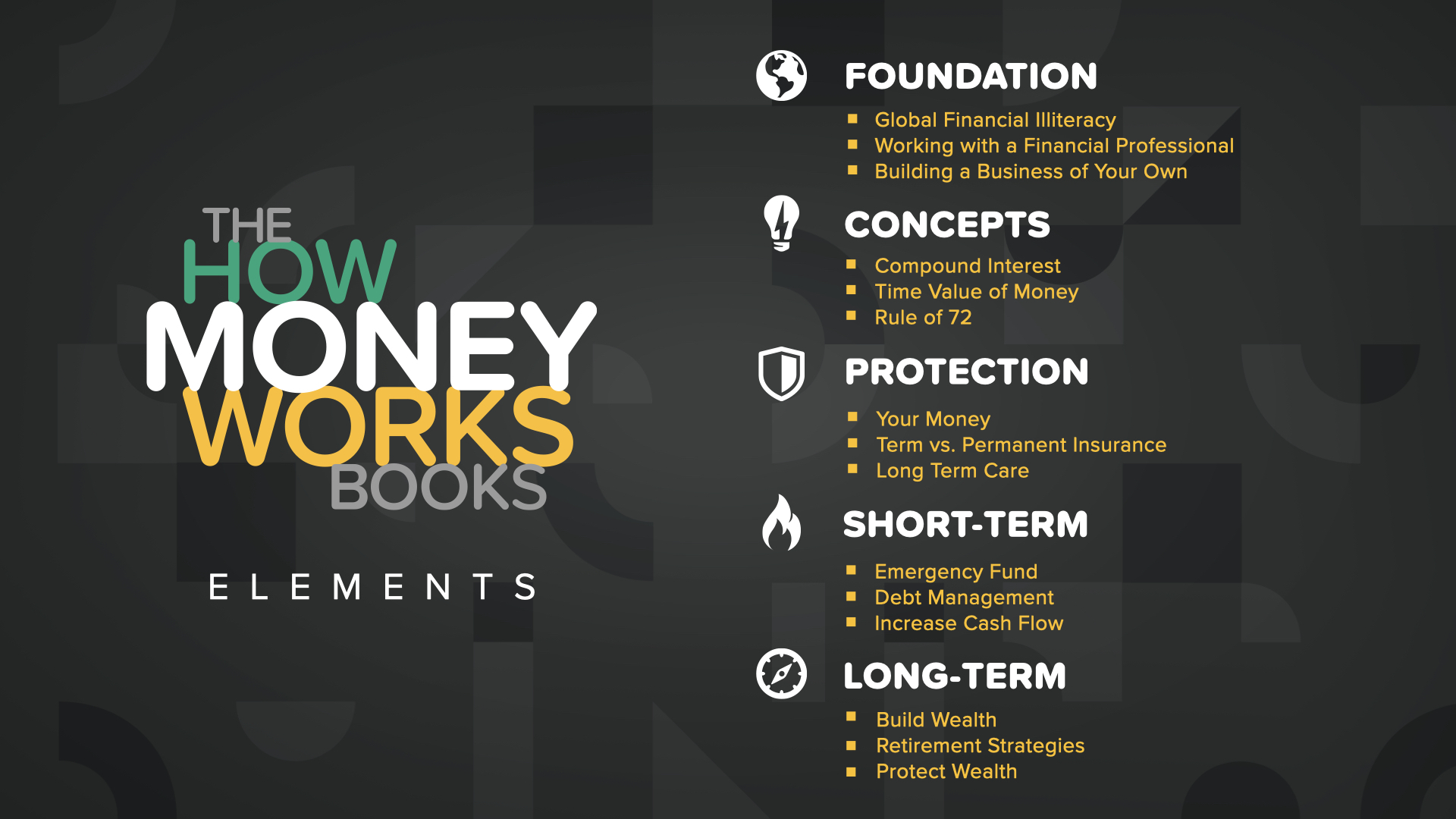 In the war for your money, there are 2 essential tools you’ll need to win. We know that the best starting point for everyone is to combine a financial education with a financial professional. Take this education seriously. You didn’t get this from school, your parents, or friends. Treat your finances with the level of dedication you put into your health. Google things, ask questions, complete the 5 Elements courses we offer… but then turn to someone you trust that does this for a living.