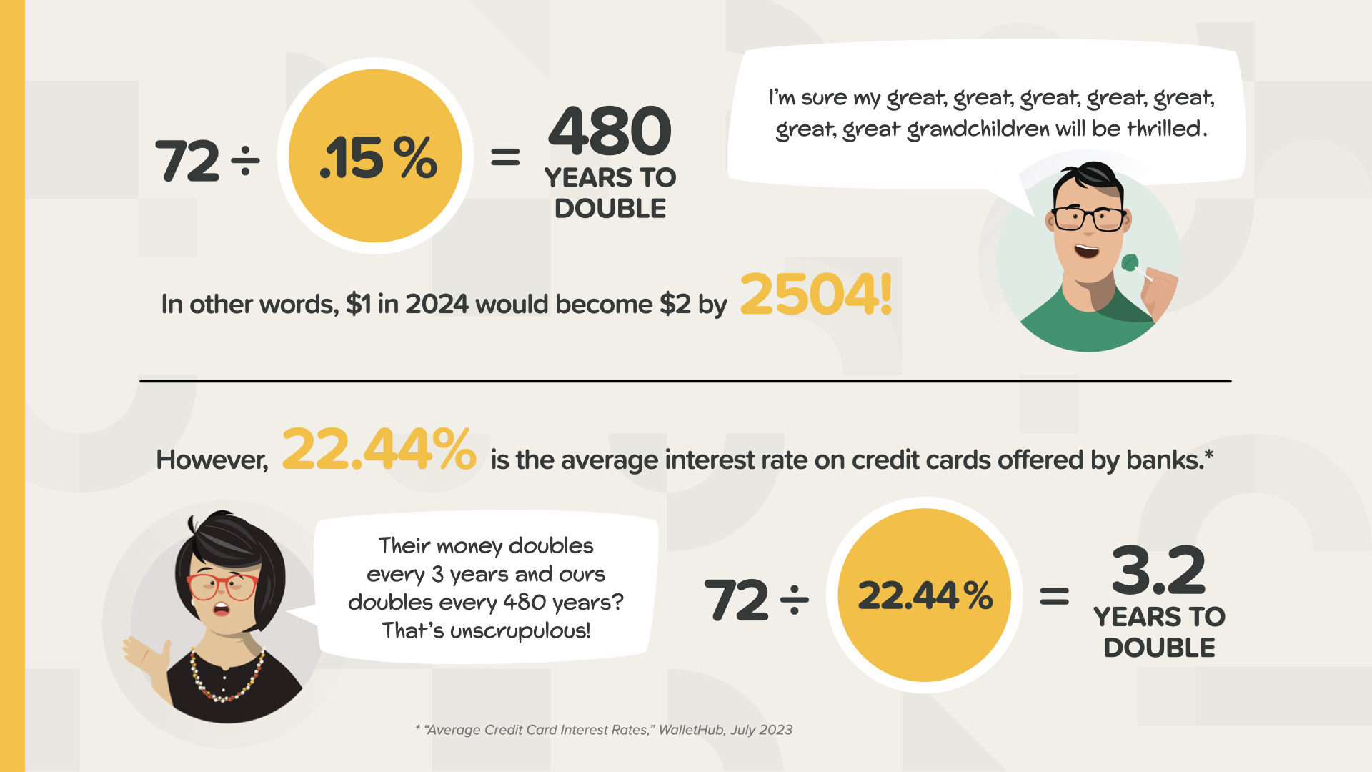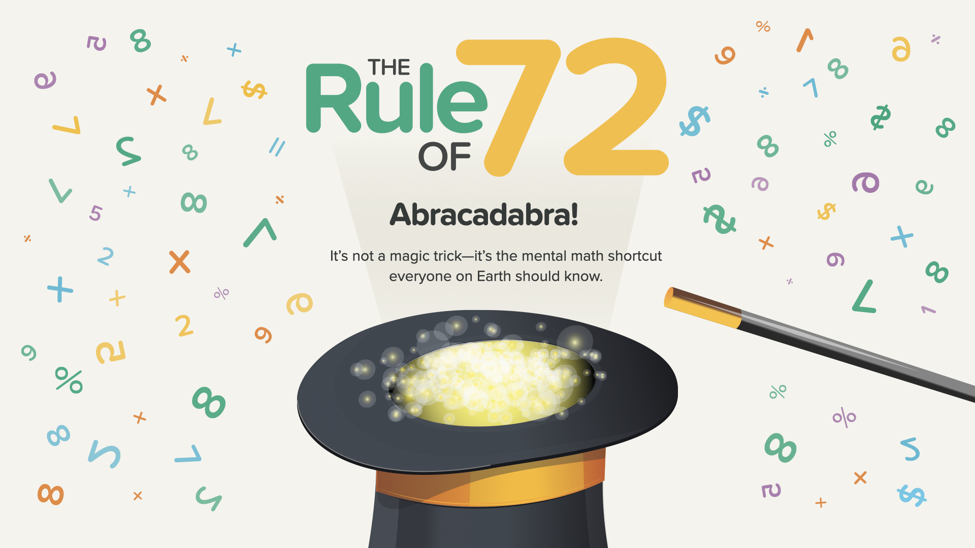 Are you having fun? We’re closing in on today’s class. Now, my favorite part. It’s time to learn the Rule of 72. Have any of you ever heard of it before? It’s a little known mental math shortcut that the wealthy have used for years. Everyone should know it.