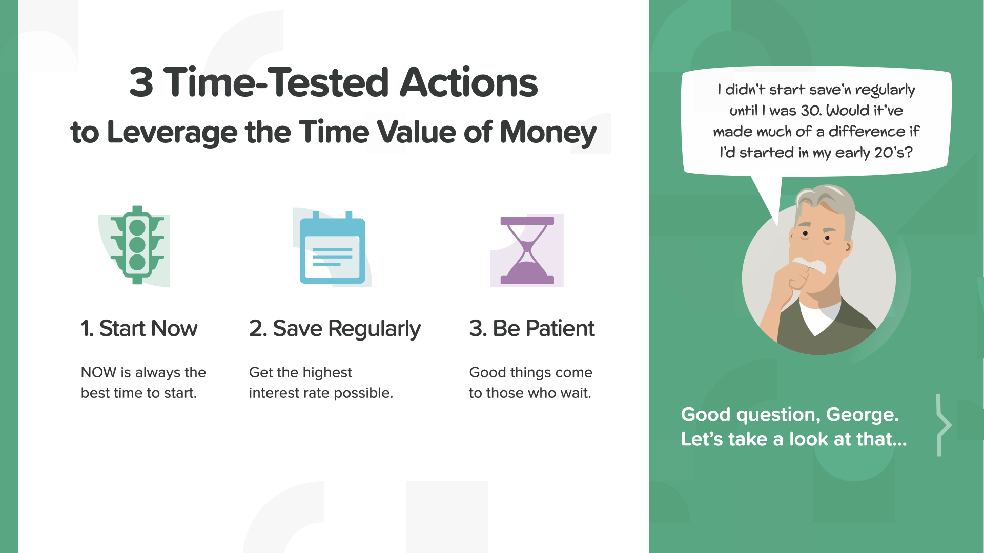 There are 3 ways to leverage the Time Value of Money. Start now, save regularly, and be patient.