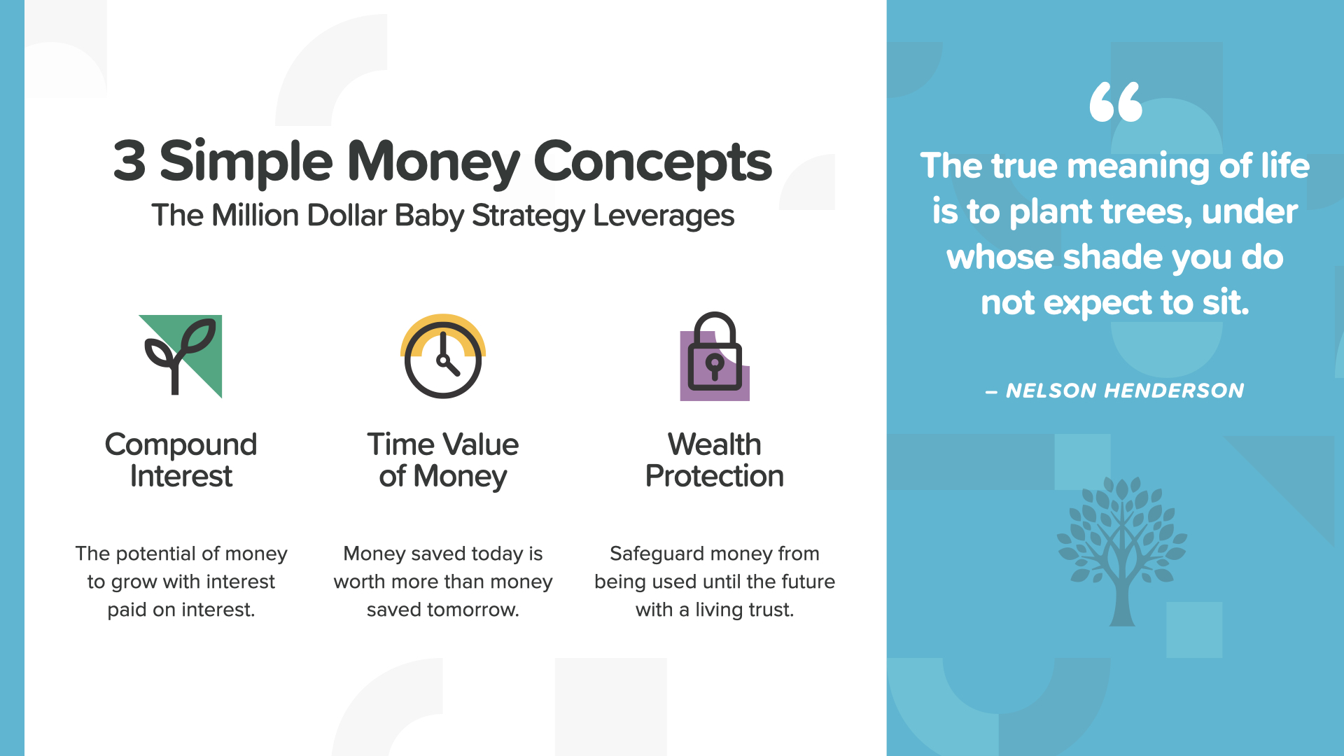 Million Dollar Baby leverages 3 simple money concepts: the Power of Compound Interest, the Time Value of Money, and Wealth Protection. This is one of my favorite quotes… Nelson Henderson said, “The true meaning of life is to plant trees, under whose shade you do not expect to sit.”