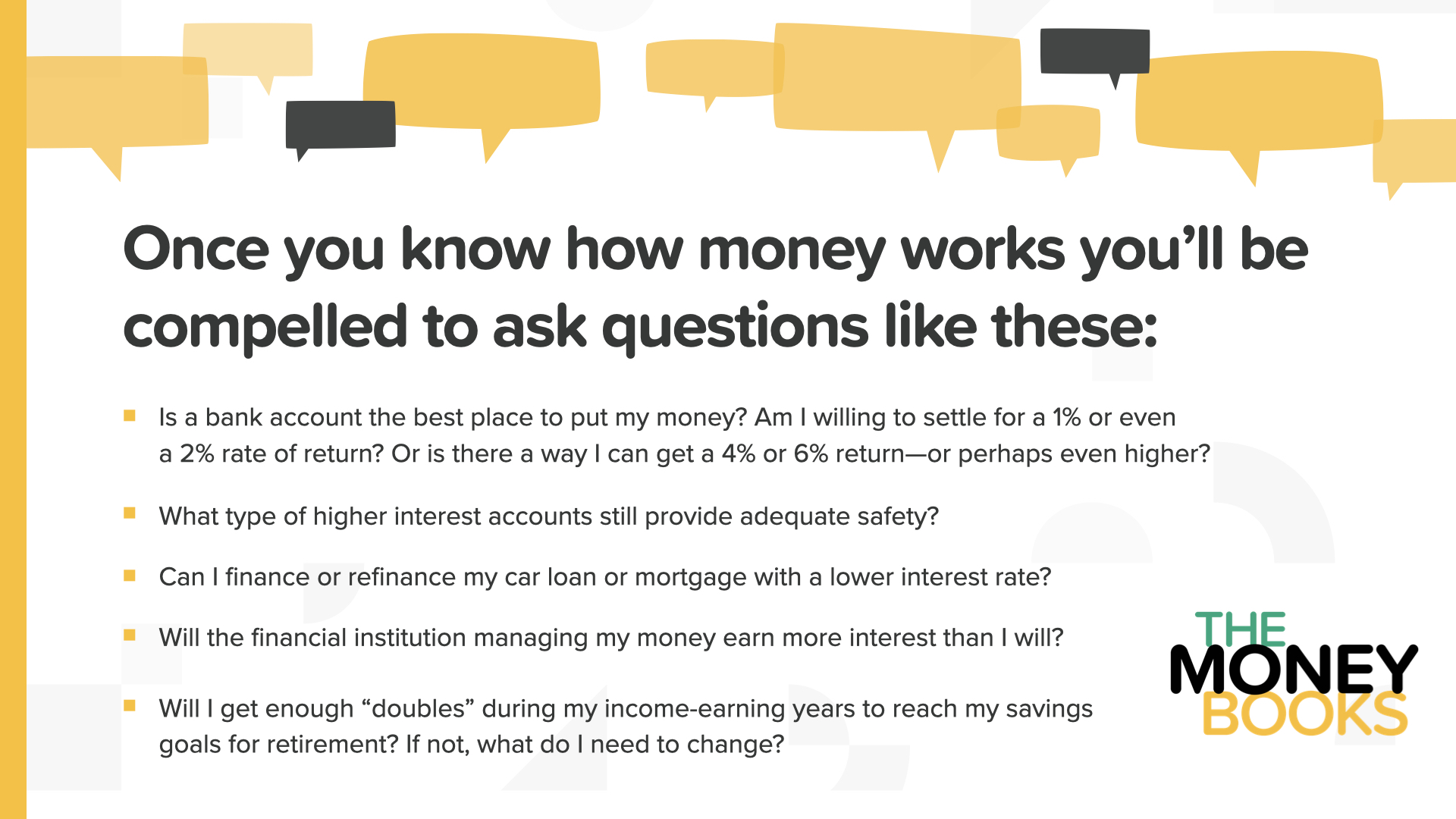 At a rate of return of 0.15%, if you divide that into 72, you’re looking at 480 years for your money to double. By the year 2504! As Clark says, his great, great, great, great, great, great, great grandchildren will love it. And, just so we’re clear, the same place that gives you 0.15%, can charge you 22% or more for a credit card. That means their money doubles every 3 or so years. Now you see why the subtitle of the book is “Stop Being a Sucker.” You need to know how money works today, not tomorrow—TODAY.
