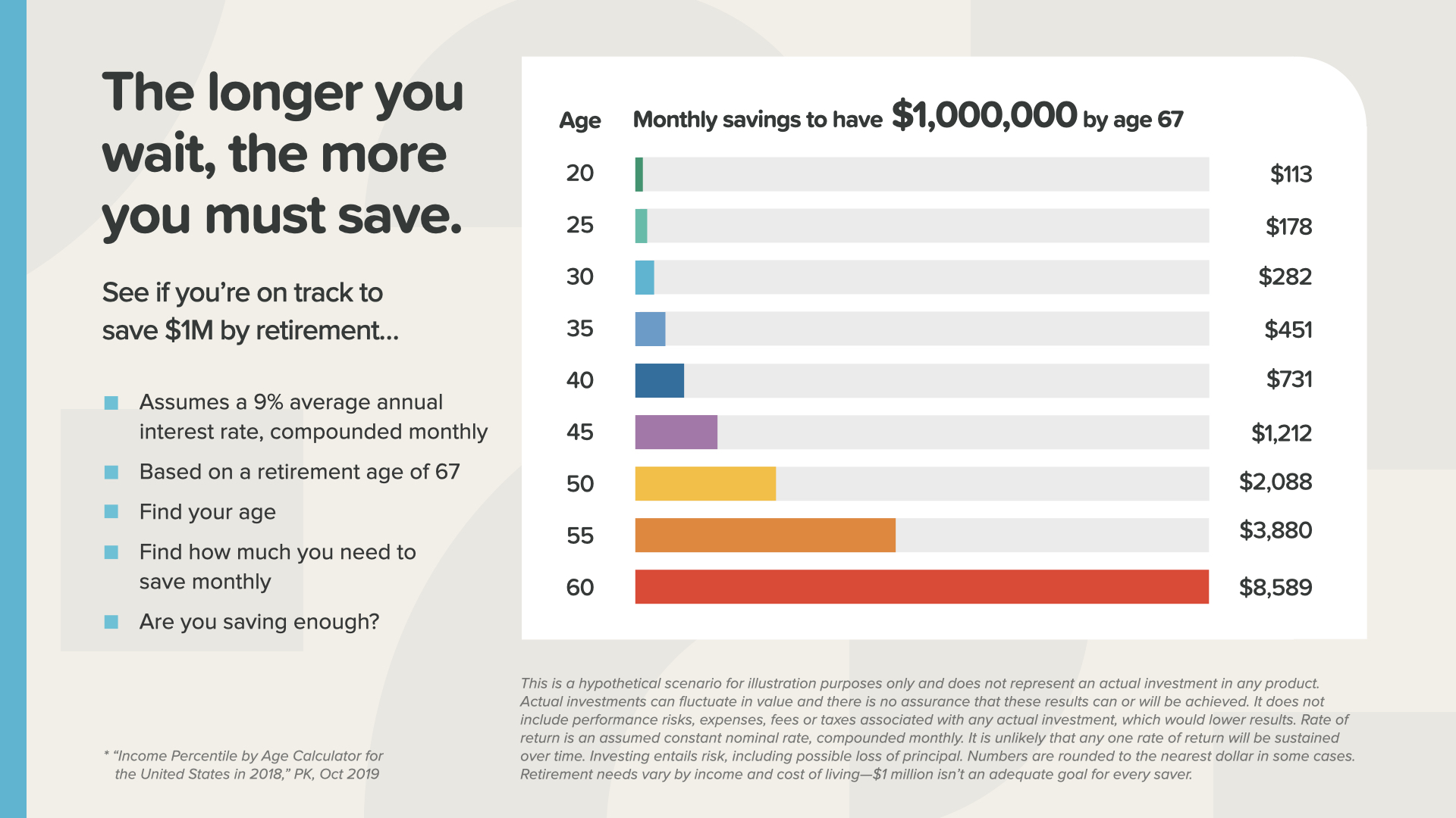 This is a common sense principle to understand that is frequently ignored. The longer you wait, the more you have to save to hit your goal. Don’t wait.