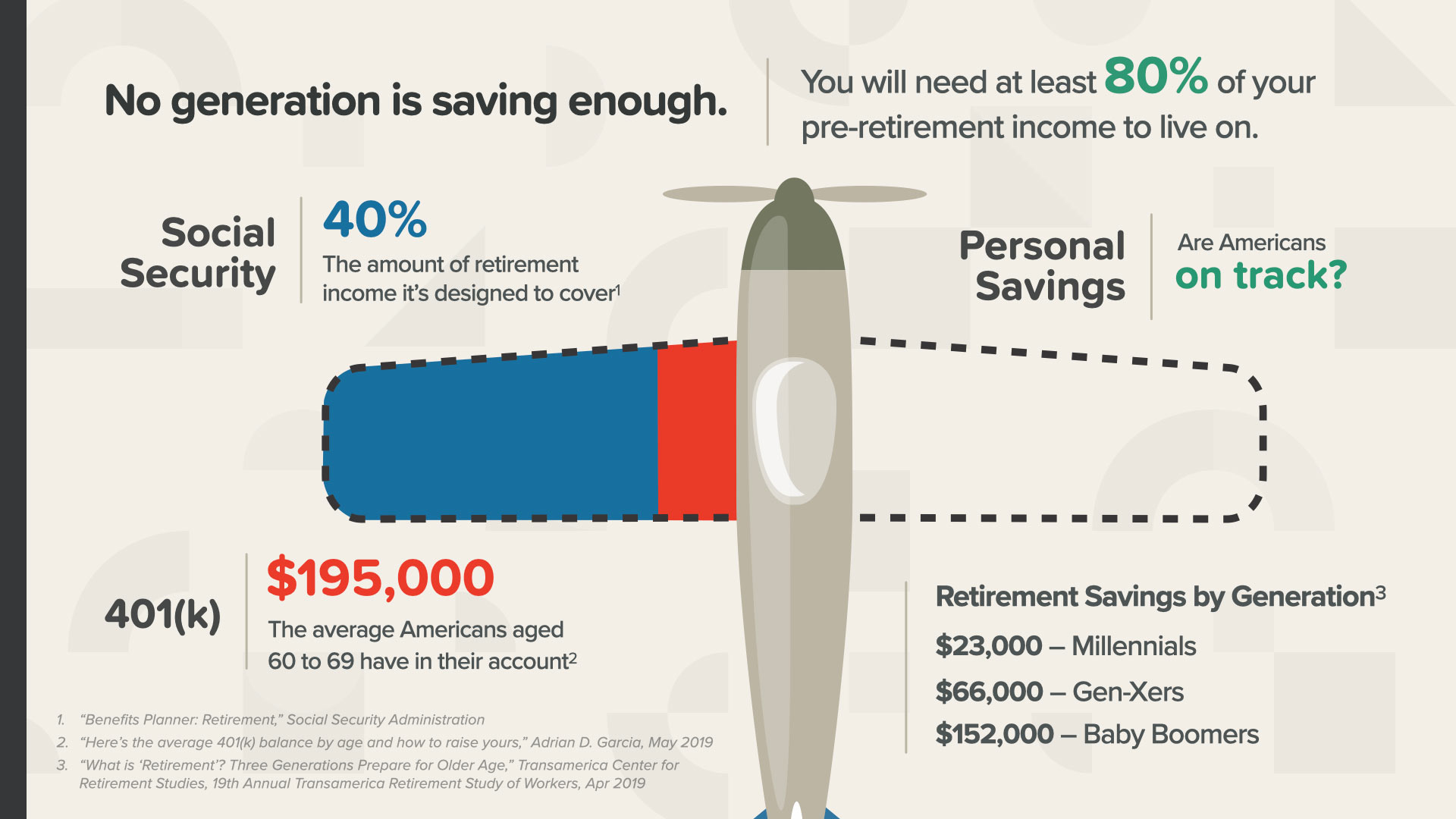 Think of your retirement like an airplane—it needs both wings to fly. Social Security and your 401(k)—if you have one—can make up one wing of the income you plan to live on in retirement. The other wing is completely up to you—your responsibility. If you hope to live on at least 80% of your pre-retirement income, you’ll need to be serious about what you put away. The hard truth is that no generation is saving enough for today’s financial realities—look at those numbers—Millennials, Gen-Xers, Baby Boomers—all of them are in trouble when it comes to their second wing. Will you have enough savings to get your retirement off the ground? If you’re not sure, schedule a conversation with your financial professional immediately to discuss this responsibility.