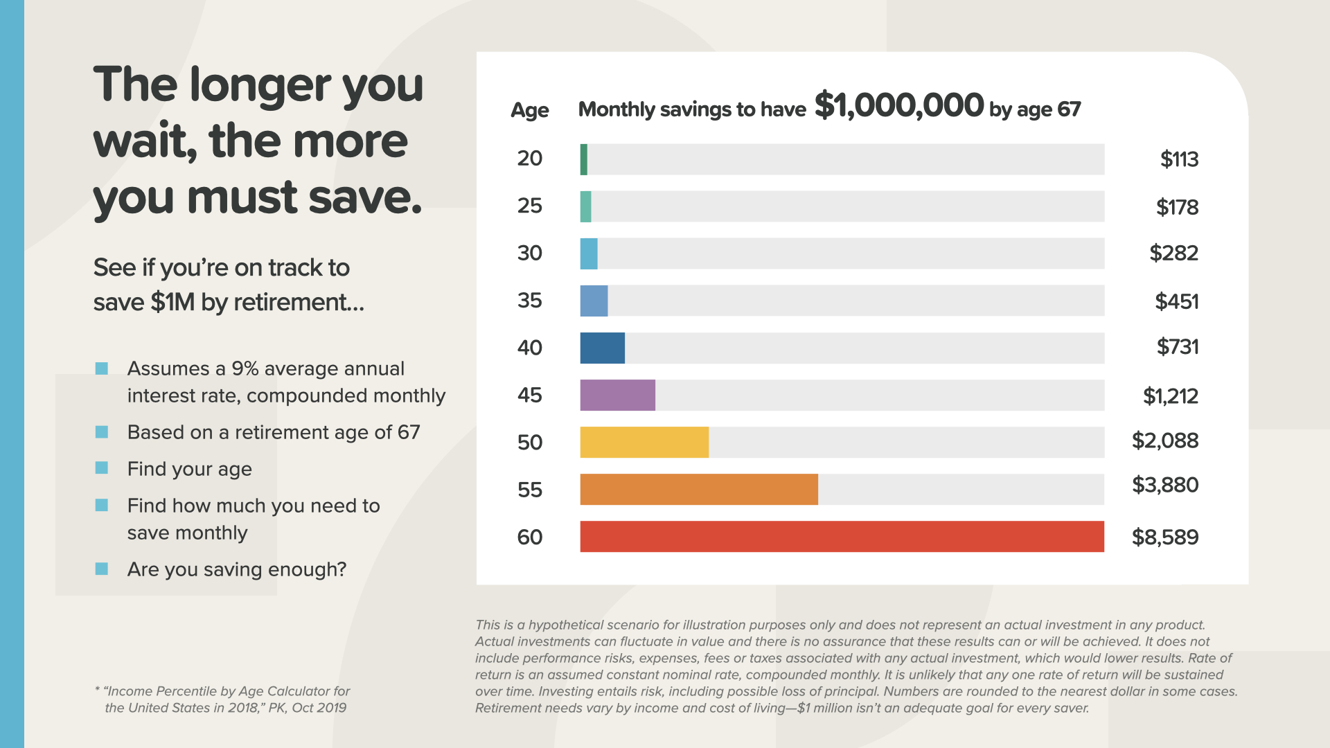 Here’s a picture of the numbers that breaks it down by age. For each million you want at retirement, you can see the monthly amount you need to save. At age 30, you need to save $282 per month to have $1 million at retirement. But if you wait until age 40, you need to save $731 per month. At some point, you will outpace your ability to hit the monthly savings amount required. You simply won’t be able to afford it. At that point, you’ll have 2 choices—shrink your dreams, or find a way to earn more money.