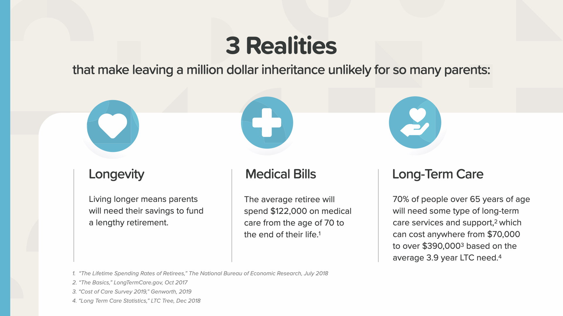 We know how hard it is for retirement-aged parents to preserve an inheritance for adult children. With seniors living longer, almost all of their savings may be required to cover decades of expenses, including medical bills and long-term care. This new reality of longevity can remove the possibility of leaving an inheritance the old way.