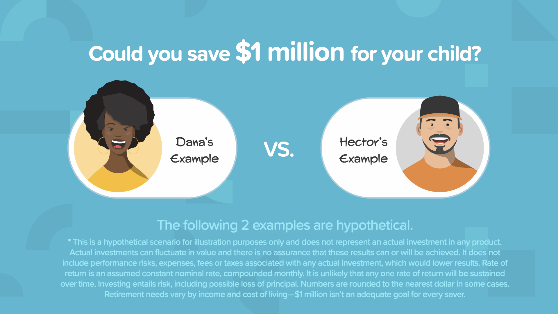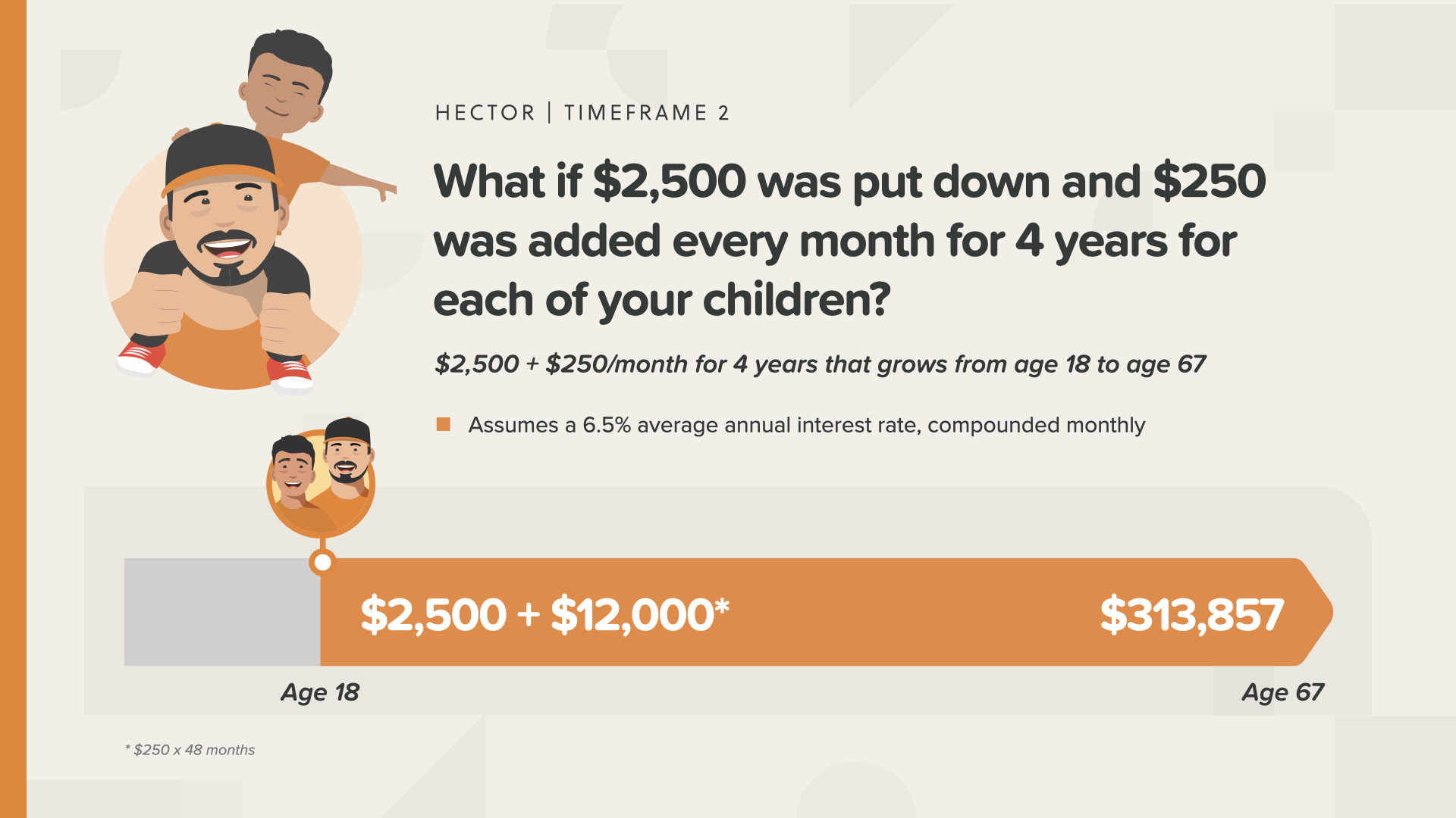 Hector doesn’t have $13,000 just sitting around, but he still wants his son to retire with $1 million. He and his relatives can work together to save just $2,500 now and then just $250 each month for the next 4 years. Then like magic, they’ll hit the goal too—his son also retires with $1 million waiting for him.