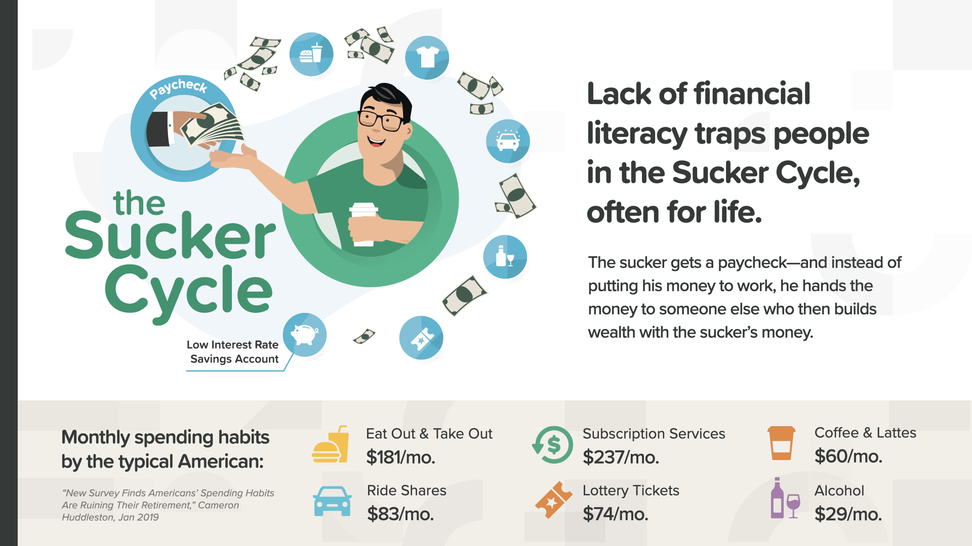 Meet the Sucker Cycle. It’s the trap of foolish spending and low interest saving that goes on and on—month after month—year after year—slowly sucking away your potential to be wealthy, free, and in control. Every couple of weeks the cycle repeats—too much eating out, unnecessary online purchases, another streaming subscription. Most people know how to earn money and spend it—but that’s it. It’s time to break the Sucker Cycle.