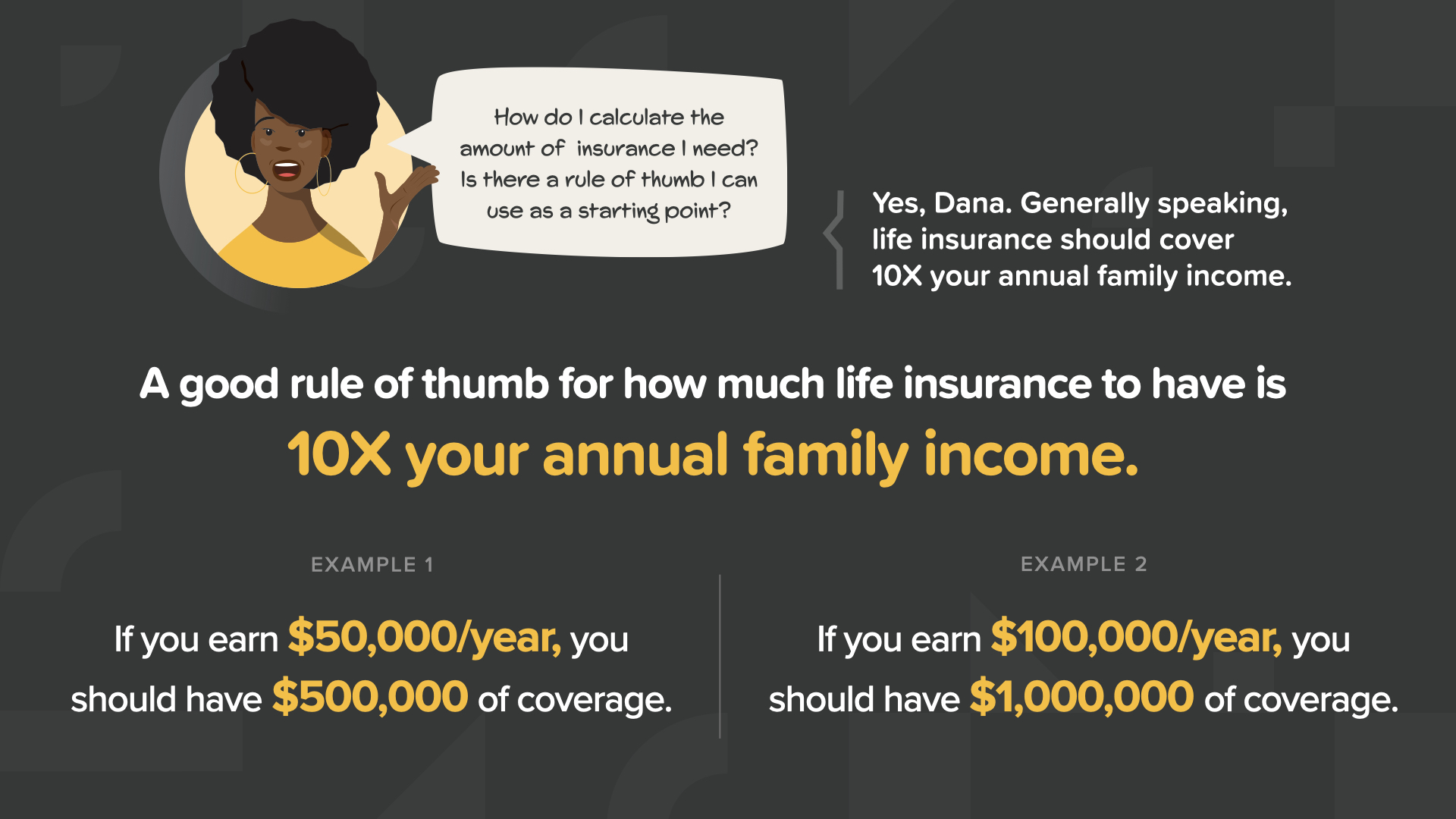 How much life insurance should you have? The answer is that it’s different for everyone, based on your situation. However, as a rule of thumb, we recommend you consider having life insurance coverage that’s at least 10X your annual family income. As an example, if you earn $50,000/year, you should consider $500,000 in coverage. At a conservative 5% rate of return, interest on that lump sum would replace half of your income.