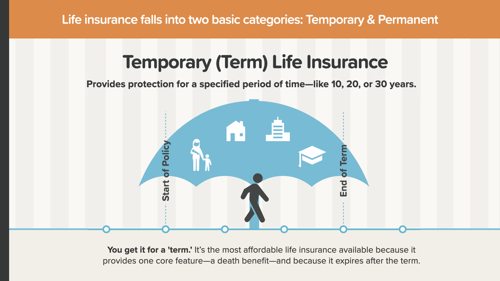 Life insurance falls into two basic categories: Temporary and Permanent. First, let’s look at Temporary life insurance, which is more commonly called "Term" insurance. It’s called that because it provides life insurance protection for a specified period of time—like 10, 20, or 30 years. It’s the most affordable life insurance available because it provides one core feature—a death benefit, which is the money paid to the beneficiary when the insured dies—and because it expires after the term.