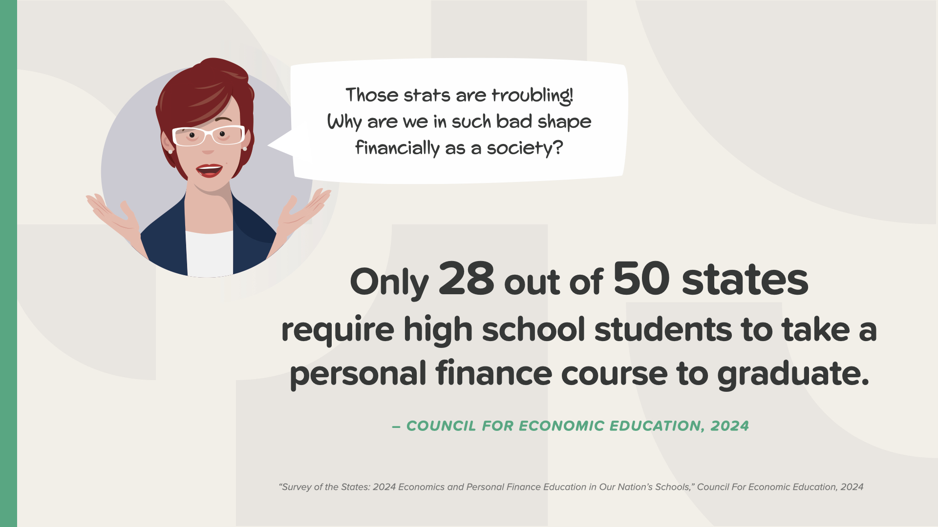 How did this happen? One way is that only 28 states make you take one class on money in high school—and of those that do, they only scratch the surface with topics like balancing a check book. Do you think that’s enough? What percentage of schools teach sex ed, lacrosse, and broadcast journalism? Almost 50 out of 50. You can’t make this stuff up. It makes no sense to me either.