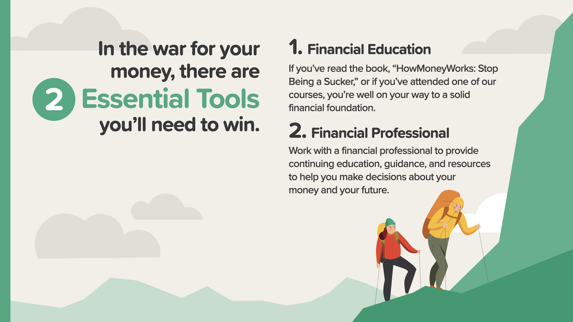 In the war for your money, there are 2 essential tools you’ll need to win. We know that the best starting point for everyone is to combine a financial education with a financial professional. Take this education seriously. You didn’t get this from school, your parents, or friends. Treat your finances with the level of dedication you put into your health. Google things, ask questions… but then turn to someone you trust that does this for a living.