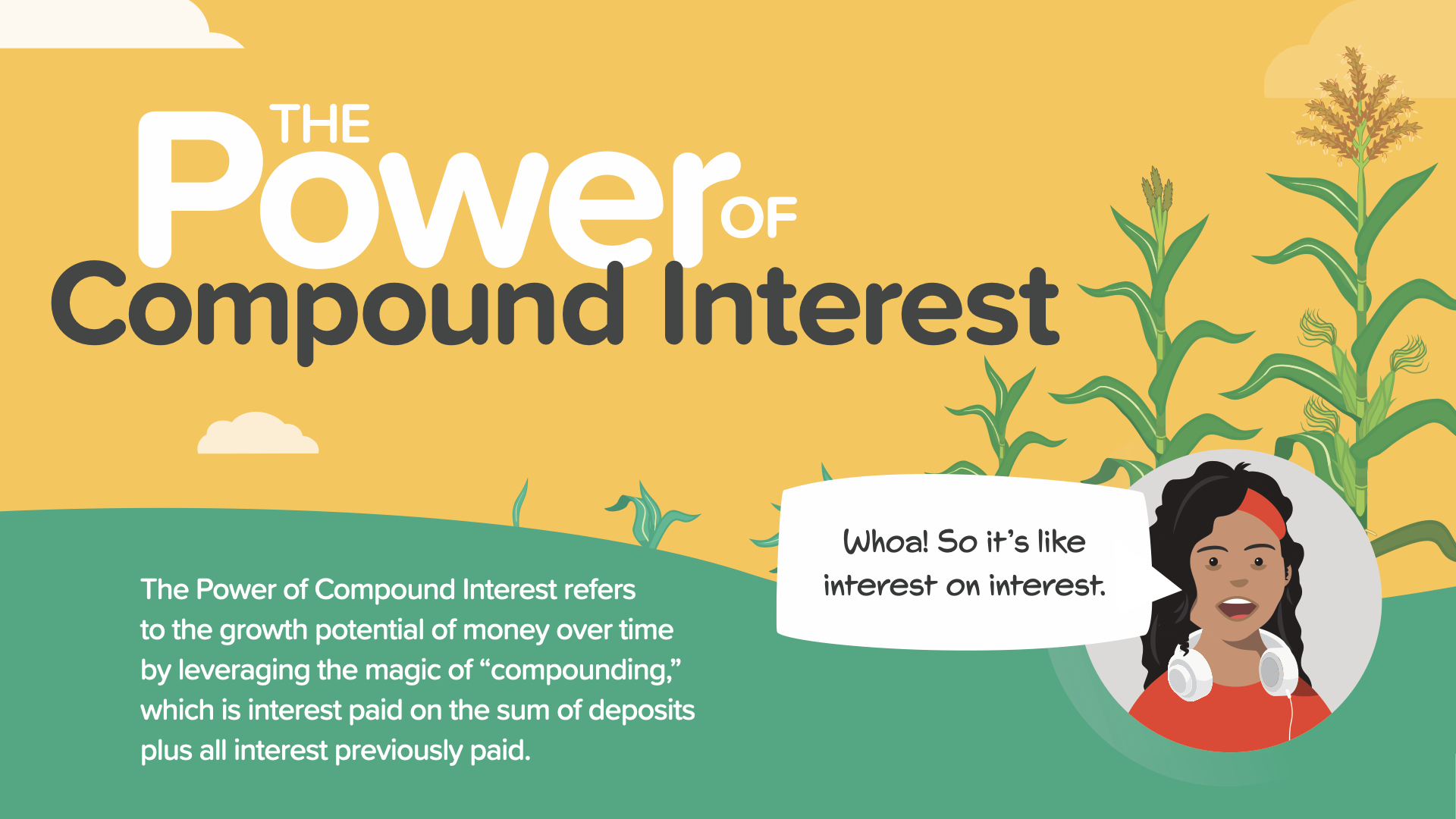 Let’s spend a few minutes learning about the Power of Compound Interest. The Power of Compound Interest refers to the growth potential of money over time by leveraging the magic of “compounding,” which is interest paid on the sum of deposits plus all interest previously paid. Or as Zoey puts it—interest on interest.