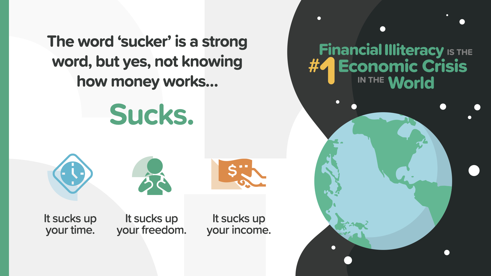 Financial illiteracy is the #1 economic crisis in the world. We know the word ‘sucker’ sounds insulting. Unfortunately, that’s the best way to describe someone who can be taken advantage of because they don’t know how things work. And not knowing how money works does suck. It can suck up your time, suck up your freedom, and even suck up your income. Now that sucks!