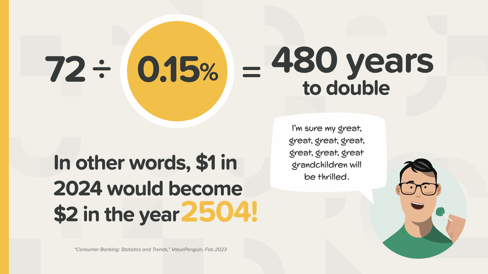 At a rate of return of 0.15%, if you divide that into 72, you’re looking at 480 years for your money to double. That’s the year 2504! As Clark says, his great, great, great, great, great, great, great grandchildren will love it.