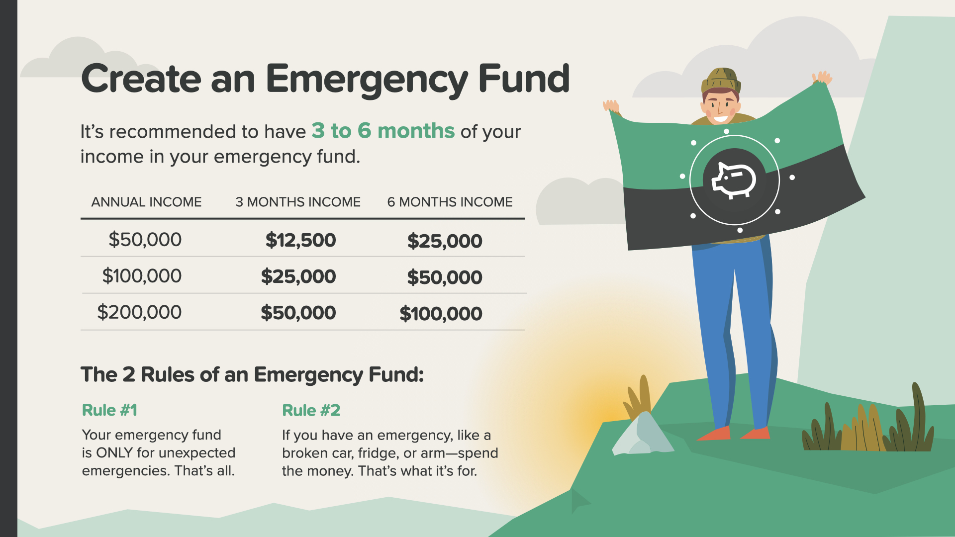 If you’re currently living paycheck-to-paycheck—like many people are today—your emergency fund could be the insulation that separates you from financial disaster if something happens. Check out these sample annual incomes and how much you’ll need for our 3-6 months income guideline. There are 2 Rules of an Emergency Fund… Rule #1 - Your emergency fund is ONLY for unexpected emergencies. That’s all. It’s not for gifts, getaways, or bogo sales. And it doesn’t matter if it sits in your checking, savings, or a separate account—as long as you’re not tempted to use it for anything but a real emergency. Rule #2 - If you need to use your emergency fund to fix a car, replace the fridge, or for an ER visit, don’t hesitate to use this money. That’s what it’s for so you don’t have to rely on credit cards or taking on debt. Just make sure that afterwards you add back a little money every month until your emergency fund is full again.