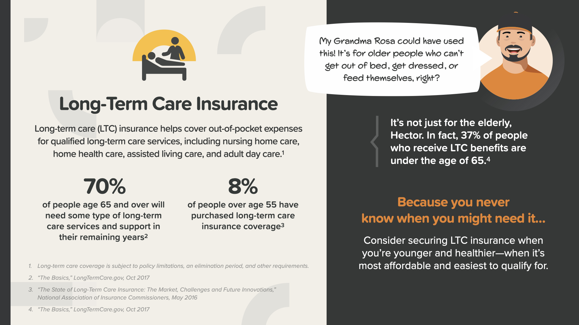 Long-Term Care—LTC—insurance coverage helps cover out-of-pocket expenses that can really add up. It can be used to pay for qualified services like nursing home care, home health care, assisted living care, or adult day care. And you never know if—OR WHEN—you might need it.
