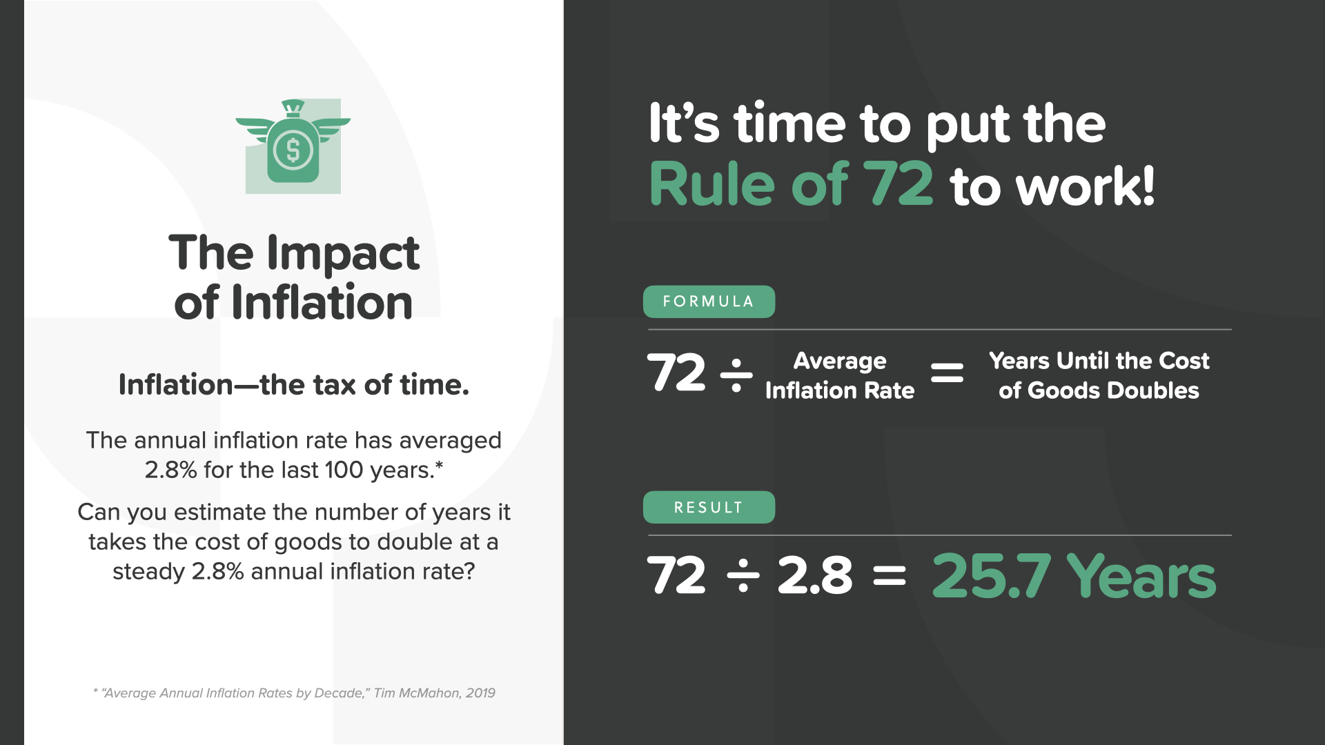 Inflation is also known as “the tax of time.” The annual inflation rate has averaged right at 2.8% for the last 100 years. Can you estimate the number of years it takes the cost of goods to double at a steady 2.8% annual inflation rate? It’s time to put your knowledge of the Rule of 72 to work! The answer is almost 26 years! You can see that one of the essential reasons to build wealth using the power of compound interest is to stay ahead of inflation. When you know that this enemy is slowly devaluing your savings by raising the cost of goods, it should drive you to be even more committed to your growth building strategy. Don’t let it scare you. Let it drive you to action!