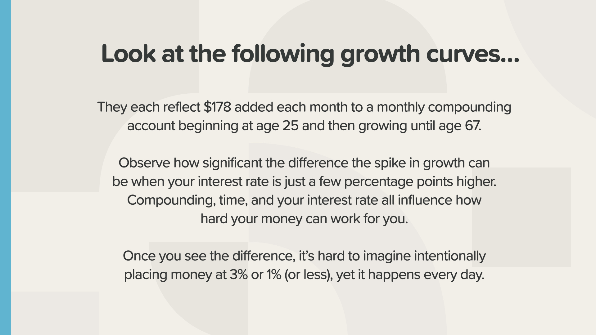 $178 saved each month from ages 25 to 67 at different returns creates very different results. Most people don’t understand this—which explains why they choose unfortunate places to save their money.
