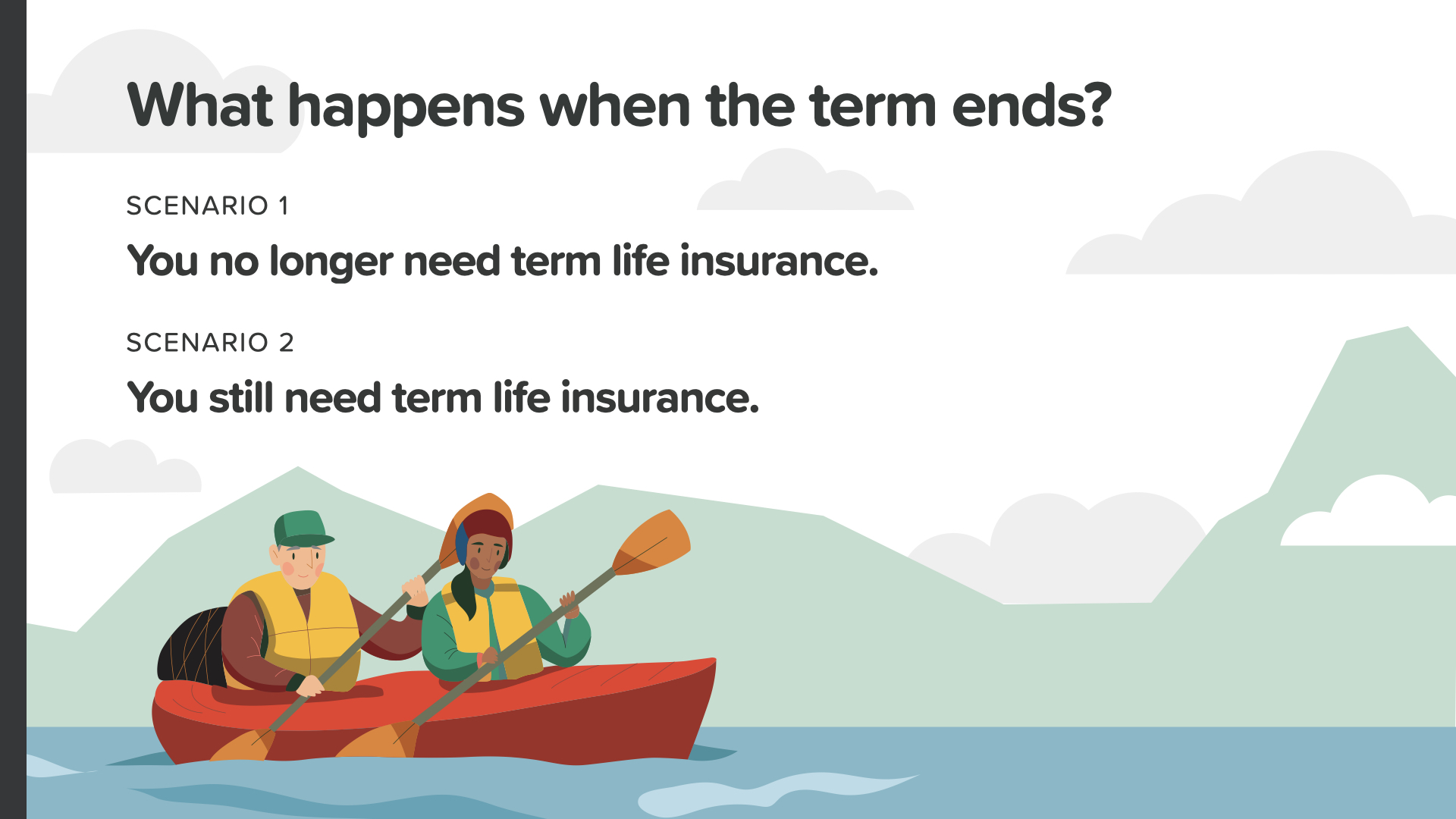 But what happens when the term on your insurance ends? There are two scenarios you can look at. Scenario 1 is that if you don’t need coverage anymore, you can simply let your policy end. No fuss, no muss. But what if, after your term, you still need coverage because you’re still paying off your home or you’re a single income couple? Or maybe you’re supporting grown children or grandchildren—or you’re still running your company? For these reasons and others, you might consider Scenario 2—keeping your term insurance.
