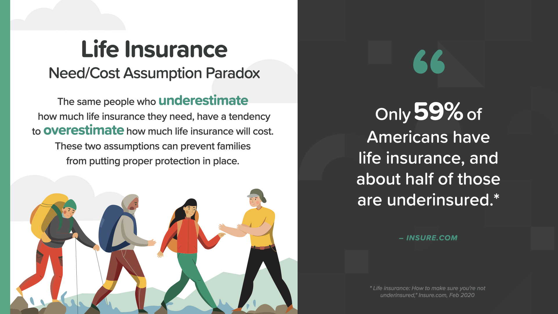 The same people who underestimate how much life insurance they need, have a tendency to overestimate how much it will cost. Both assumptions can keep families from putting proper protection in place. As insure.com says, “Only 59% of Americans have life insurance, and about half of those are underinsured.”