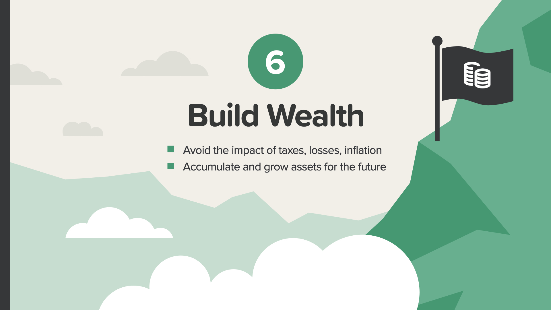 Milestone #6 is a big one AND an exciting one—it focuses on Building Wealth. This is the Milestone where results appear on your bottom line. This is where you avoid the impact of taxes, losses, and inflation and do your best to accumulate and grow your net worth.