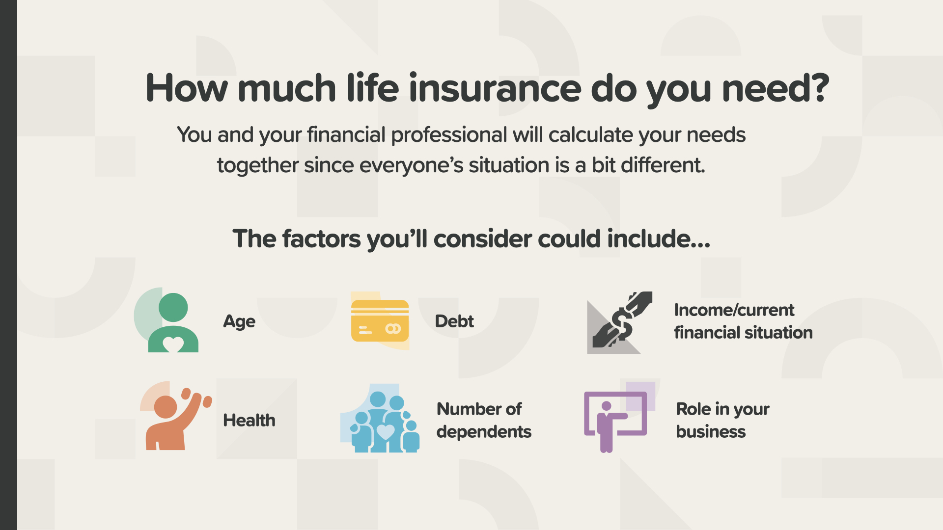 For a more specific calculation of your family’s needs, ask your financial professional. Together, you can consider factors like how old you are, how much debt you have, your health, your number of dependents, your role in your business, and your overall financial situation.